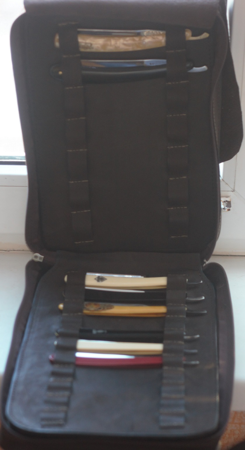Предложу кейс с кожи Бешеного коня (Crazy horse). Кожа мягкая, приятная, темно-коричневого цвета. Размер 300 мм-220 мм- 65мм. Вместимость 36 бритв. Учтен размер бритв. Между сторонами - язык-перегородка с замши. По бокам сделаны ячейки для Английских, Французских рубанков, по средине для более компактных Немцев, Шведов. Не скажу, что работа высший пилотаж, но вещь очень практичная. Продан. Spoiler Show