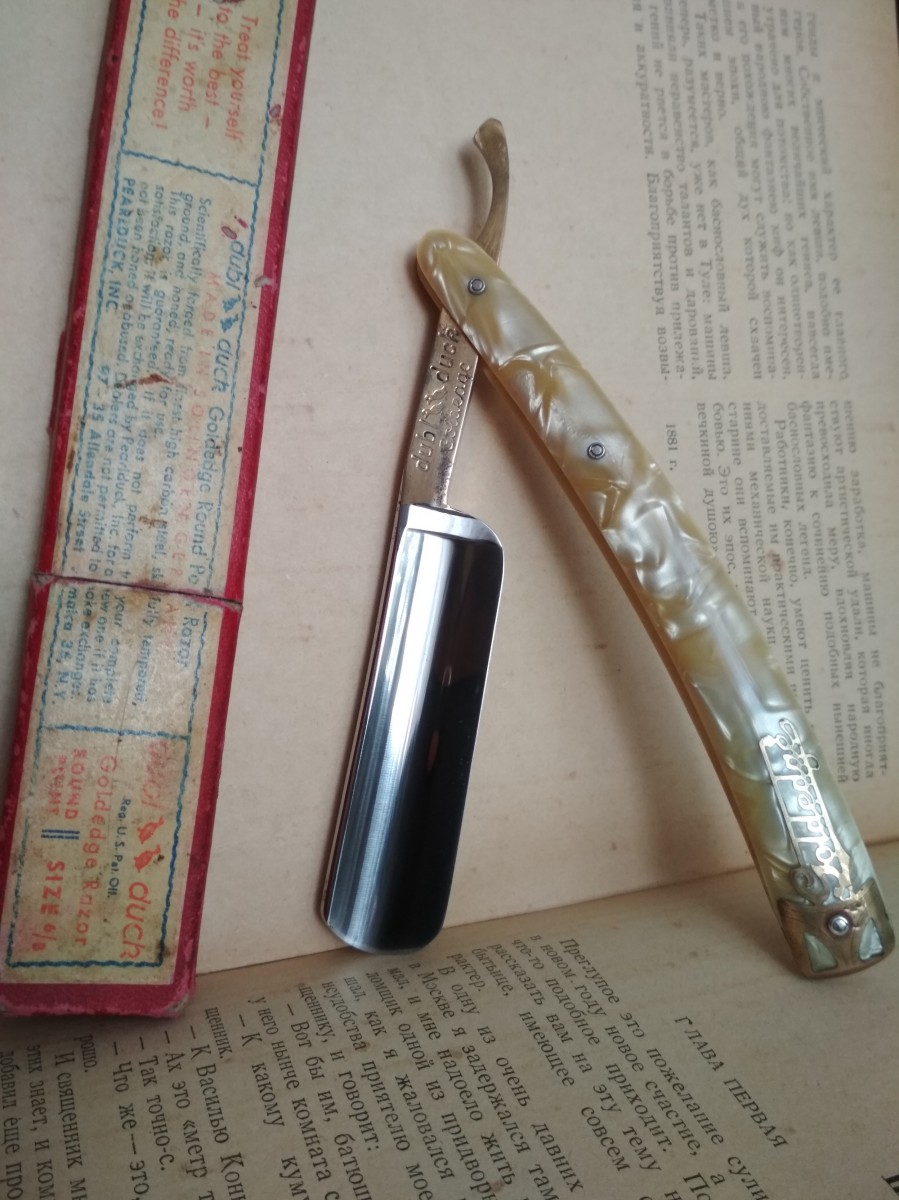 Данная ТМ в представлении не нуждается. Хотелка многих, особенно из США Бритва с коробки. В использовании не была. Ничего не делалось. Сохранилась родная позолота., с небольшими (локальными) "рыжиками". Считаю большой глупостью трогать там что-то. Бритва не для новичка!!! Полотно закрывается с небольшим перекосом в ручку, частое явление на целлулоидных ручках (время). Полотно 99% в идеальном состоянии (за исключением мизерных грешков). Лично я редко видел бритвы данной ТМ в таком сохране, с такой шириной полотна. Доп фото и инфу - вышлю на почту. Продается не спешно. 250$. Spoiler Show
