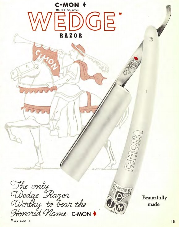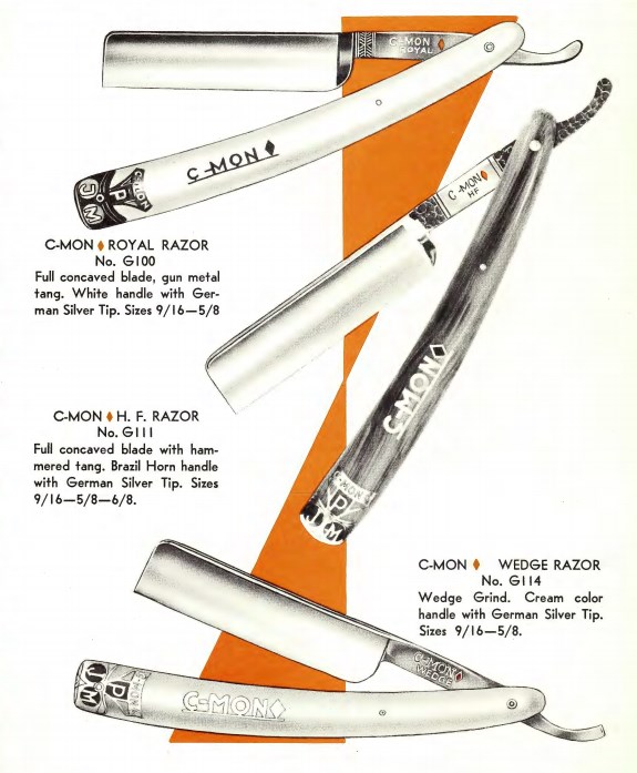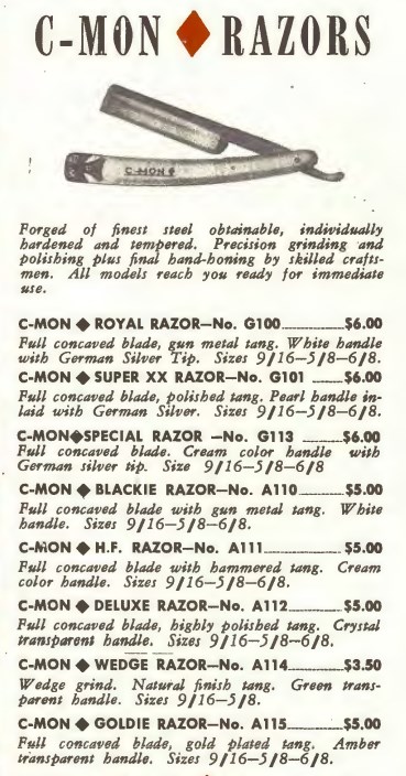 Вот тут лежат три ежегодных каталога фирмы Peter J. Michels, дистрибьютора инструментов для салонов красоты и парикмахерских за 1953, 1954, 1963 годы. Каталоги номерные, номер 40, 41 и 50. Значит фирма работала все эти годы и, не нарушая нумерации, выпускала каталоги. скопировал все бритвы от туда: 1953 год Spoiler Show Spoiler Show 1963 год Spoiler Show Spoiler Show 1953 год C-MON - ROYAL № G100 размеры 9/16, 5/8, 6/8 Made in Germany - SUPER XX № G101 размеры 9/16, 5/8, 6/8 Made in Germany - SPECIAL № G113 размеры 9/16, 5/8, 6/8. Made in Germany - BLACKIE № G110 размеры 9/16, 5/8, 6/8. - HF (Hand Finished) № A111 размеры 9/16, 5/8, 6/8. Made in Germany - DELUXE № A112 размеры 9/16, 5/8, 6/8. - WEDGE № A114 размеры 9/16, 5/8. - GOLDIE № A115 размеры 9/16, 5/8, 6/8. A.I.C. - № 12, размер 6/8 - № 23, размер 6/8 - № 34, размер 9/16, 6/8 - № 45, размер 9/16, 6/8 MERIT - № A613, размер 9/16, 5/8. PRESTO - № G913 размер 5/8 SPEAR - № A713, размеры 9/16, 5/8, 6/8. - № G713, размеры 9/16, 5/8 TRU-EDGE - № G812 DELUXE размер 5/8 - № G813 SPECIAL размер 5/8 1954 год C-MON - SPECIAL № G113. размеры 9/16, 5/8, 6/8 - BLACKIE № G110 размеры 9/16, 5/8, 6/8 - SUPER XX № G101 размеры 9/16, 5/8, 6/8 - ROYAL № G100 размеры 9/16, 5/8 - H.F. № G111 размеры 9/16, 5/8, 6/8 - WEDGE № G114 размеры 9/16, 5/8 MERIT - № 613, размер 9/16, 5/8 SPEAR - № G713, размер 9/16, 5/8, 6/8. TRU-EDGE - DELUXE № G812 размер 9/16, 5/8 - SUPERBE № G813 размер 9/16, 5/8 1963 год C-MON - CADILLAC № G105. размеры 9/16, 5/8, 6/8 - BLACKIE № G110 размеры 9/16, 5/8, 6/8 - SPECIAL № G113. размеры 9/16, 5/8, 6/8 - HF № G111 размеры 9/16, 5/8, 6/8 - SUPER XX № G101 размеры 9/16, 5/8 - WEDGE № G114 размеры 9/16, 5/8 - Special WEDGE № 115 размеры 5/8 MERIT - № 613, размер 9/16, 5/8 SPEAR - № G713, размер 9/16, 5/8, 6/8 TRU-EDGE - DELUXE № G812 размер 9/16, 5/8 - SUPERB № G813 размер 9/16, 5/8 VULCAN № 193 размер 9/16, 5/8 GERMAN BLUE STEEL № 198 размер 9/16, 5/8 Re: Peter J. Michels, Brooclyn NY, Germany - Spear brandОсновная их торговая марка после 1945 года была, оказывается, вовсе не колокол со стрелой, а C-MON.