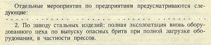 Цех по производству опасных бритв введен в строй в 1939 году, однако, судя по табличке, бритв не произведено, только в плане стоит 153 тысячи на 1940 год.