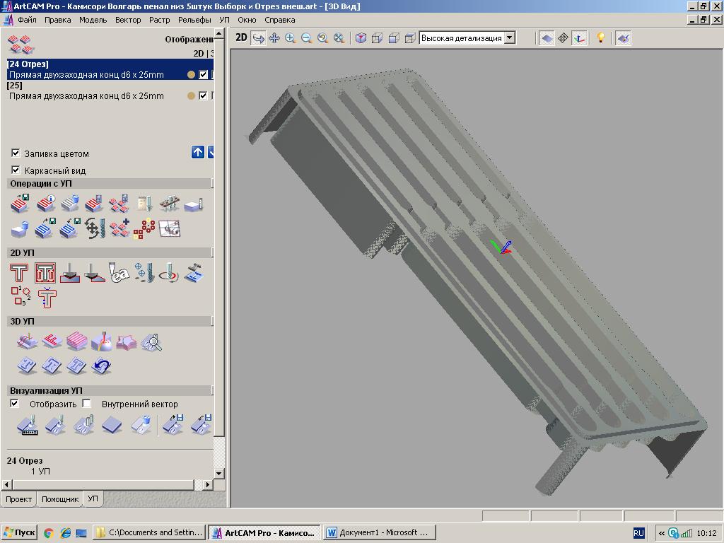 Поскольку размеров камисори своей ты не дал, то вот слепил за пол-часа нечто под камисори типа (под фрезы и дерево, что у меня есть сейчас): размеры использованных выборок: 1. под клин - 60х6х25мм 2. под ручку - 110х10х12.5мм (2выборки и 2перехода) 3. 1й переход - 8х3.5х6мм (опирается шейка бритвы - между ручкой и клинком) 4. 2й переход - 8х10х8мм (опирается/фиксируется боковыми сужениями/если надо/ ручка бритвы, ближе к концу ручки) 5. Общая длина (габарит) камисори - не более 170мм 6. размеры пенала (низ) - 22х180х27.5мм 7. крышка - 22х180 х 10мм Итого, высота пенала со вставленной крышкой тут - 27.5+10-2=35.5мм тогда габариты пенала с закрытой крышкой итоговые - 22х180х35.5мм Это по самым простым стратегиям обработки - "2д выборка" двумя фрезами - d6 & d3.175. Крышку можно нарисовать исходя из реально нужных параметров ручки - бывают ручки у камисоров и тонкие и толстые. В принципе, если не нужно ничего "рисовать на корпусе", то и всё (кстати для меня это ещё несколько проблемно в связи с переустановкой заготовки и её центрированием, но можно и "порисовать-повырезать", в принципе, например "To: Volgar" ) на крышке. Загружаю постпроцессор в станок и за пол часа всё будет готово, как-то так, набирал этот текст дольше. PS добавил 2 вида крышки - сечение и аксономеитрия...