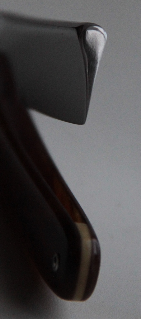 Бритва находится в прекрасном состоянии. Разобрал, немного почистил окисление полотна и в районе осевого пина и снова собрал, добавив внутренние шайбы и втулки.Сталь и кромка чистые, без дефектов. Идеальная геометрия полотна:кромочка равномерна по всей длине.Красивая, эффектная бритва для ценителей.Как и ранее писал, короткое полотно способно работать более удобно в самых проблемных местах.Бритва среднего размера, но в тоже время тяжёлая и с характером.