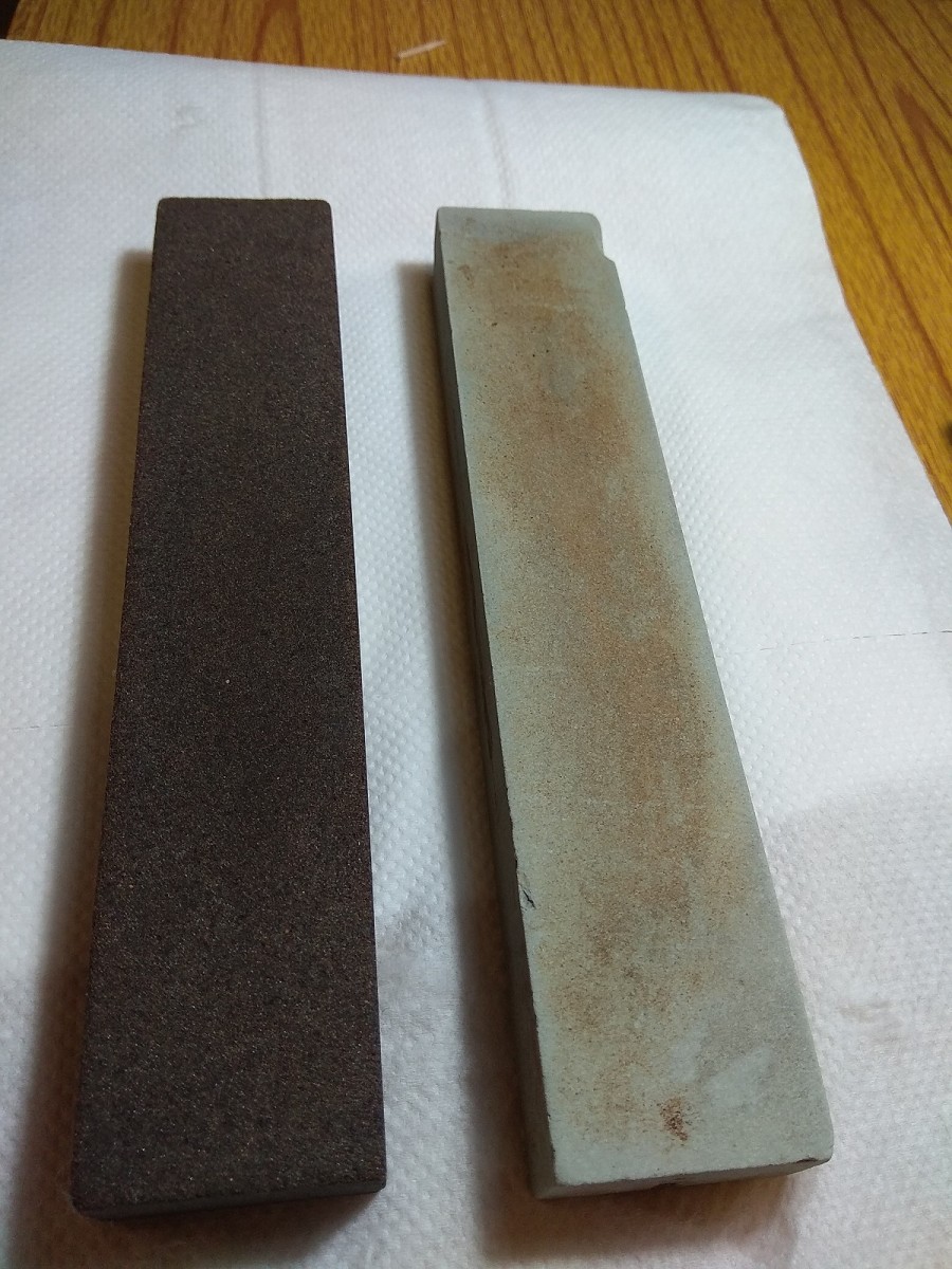 Тёмный скорее - электрокорунд нормальный, а более светлый - 64 С, карбид кремния зелёный (на цвет не обращайте внимания, брусок серо-белого цвета), брусок доводочный. Раньше, за неимением лучшего,на 64С правили бритвы и доводили стамески, резцы по дереву и прочий столярный инструмент.. Бесит, когда приходится пользоваться бритвой моложе себя...
