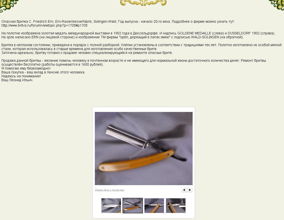 Там она 2 месяца простояла, а покупатель свой оказался... Фишка этой бритвы в металле - её можно одну оставлять, больше ничего не надо. Возраст ей 10-20 год 20-го века. Вот такие дела! З.Ы. Petrovich, тебе респект!!! Ты бы бабулю видел! Она тыщу раз спасибо сказала! Я ж все денюжки ей отдал! Инна Игнатьевна её зовут. Ремонт опасных бритв, звонить с 11-00 до 23-00, +79267729357, (viber, whats app, telegram, VK), спросить Олега.