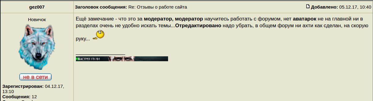 Это тебе ещё вежливо ответили, а ты даже не понял, что сделал. Сидели люди, вели светские беседы, кто пиво попивал, кто виски.. и тут такой Чапаев на лошади прискакал прямо в салун, хотя тебя попросили : - Товарищ лошадь свою привяжи на улице! Ты же не послушал, прискакал, ноги на стол. Всем замечания давай раздавать, проталкивать свой сайт, торговать тут пытаться, кстати без разрешения администрации. А Своего Мастера ты конкретно "подставил", отдал так сказать на растерзание местным аксакалам классического бритья. И какое ты отношение к себе тут ждал? Умные люди обычно сначала в разведку ходят, читают, изучают правила, а уж потом решают, регистрироваться на том или ином ресурсе. А ты всех принудительно отправляешь на свой сайт, на который без регистрации не зайти. Вот как бы не ругали данный ресурс бритва.ру, а свободы побольше будет, чем на твоём ресурсе, тут хоть гости заходят и читают полезную информацию. И у меня ещё к тебе вопрос, Гена а тебе точно 55 лет? Ну просто такое исполнить мог только школьник. Мужчина который бреется клинковой бритвой, априори не может быть плохим... ну или может