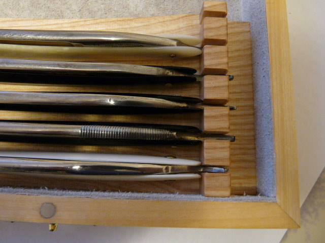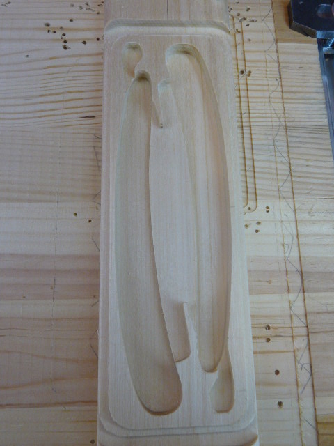 Потому путем прикидок этой пары дюжин бритв к этой "модели" разработал формы выборок (подфрезеровывая чуток там где надо и корректируя проги) и под ручки, и клины, и танги, и высоты под них всех выработал "усредненные формы выборок" под мои 2 дюжины бритовок. Так что эти формы не "просто так" от балды - это усредненные результаты натуральных замеров на осиновой модели будущего футляра. Причем исключены были только 4 бритвы из 22...24штук, по разным причинам (не вписались без визуального изменения формы выборок или больших габаритов).