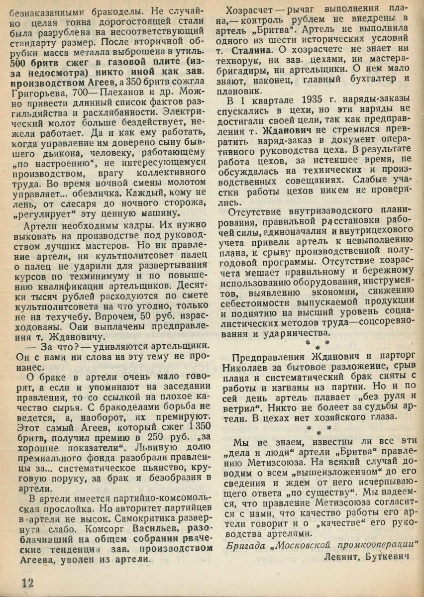 Позор зав.производством артели "Бритва" товарищу Агееву!