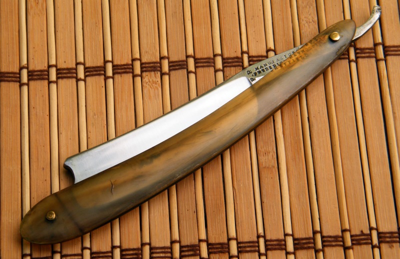 Бритва выполнена очень качественно, крайне ровная геометрия и вообще исполнена аккуратно, штамповка четкая, сталь тяжелая, приятно взять в руку. Ручку буду новую заказывать из черного рога.