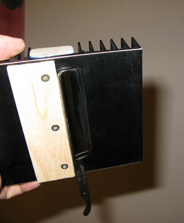 Насмотрелся я у буржуев подставок для чистки. http://razortips.blogspot.com/2009/02/m ... y-jig.html" onclick="window.open(this.href);return false; одна из версий. Идея простая. Чтоб держался и не грелся, или подставка отводила тепло. Просто дерево конечно хорошо, но тепло не отводит. Логично для этих целей использовать именно то, что было создано для этих целей – радиатор от больших транзисторов! Радиатор, 4 злосостных магнита, деревянная линейка, обрезок от клюшки который я дома нашел (это я сыну клюшку зимой укорачивал а не специально выбирал). Все остальное купил в радиомагазине. Бюджет 420ре=240 радиатор+170 магниты+10 линейка и 30 минут работы. Маленькая деталь – края радиатора надо стачивать и шлифовать. Не совсем ровные они. Собрал, протестировал – замечательно. На верхней деревянной части удобно бритву располагать под углом, она не скользит.