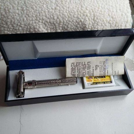 Бритвенный прибор Киевского фурнитурного завода. Абсолютно уникальная вещь. Бритвенный станок является копией изделия компании «American Safety Razor». Она была основана в 1919 году путем объединения старейшего в США производителя безопасных бритв «Star Safety Razor» братьев Кампфе из Нью-Йорка с компаниями конкурентов «Gem Cutlery» и «Ever-Ready». Конструкция запатентована еще в 1912 году бывшим совладельцем «Ever-Ready» Августом Шойбером. Эти изделия выпускались под историческими именами «Star», «Gem» и «Ever-Ready» миллионами вплоть до 40-х годов. В Европе и США они практически ничего не стоят, не как у нас. Как и кому в Киеве пришло в голову производить это не известно. Но самое главное, эти люди и не рассчитывали на штатные лезвия типа «Single Edge» с одной режущей кромкой. В России при царе их еще можно было купить, при большевиках — никак. Вопросы же импорта либо иностранной концессии рассматривать было глупо и, видимо, опасно. Разумней было бы отказаться от столь экстравагантной затеи. Сделать нормальный «жиллетовский» станок, коль приспичило. Но киевские товарищи не искали легких путей. И они нашли решение проблемы в Москве. На Шаболовке работала артель «Бритва». Ей и заказали подходящие по форме и размеру клинковые лезвия. Прототип лезвий был придуман еще в 1875 году братьями Кампфе. Трудно представить себестоимость этих лезвий в 1940 году, даже без учета непростой логистики. И, хотя москвичи не подвели, дела в Киеве явно не пошли. А тут и война случилась. И оккупация. Поучительная, но вовсе не удивительная для нашей страны история объезда на кривой козе. Нормальные герои всегда идут в обход! А вот артельщиков из «Бритвы» надо вспомнить добрым словом. Если бы не заведенный у них порядок ставить на лезвия клеймо с датой изготовления, мы не узнали бы, когда вся эта ерунда произошла. Сам Фурнитурный завод был построен еще в 1932 для производства гвоздей и комплектующих для обуви. Этим там занимаются и поныне. Бритвы больше не делают, хотя, кто их знает! Волхвы не боятся могучих владык,