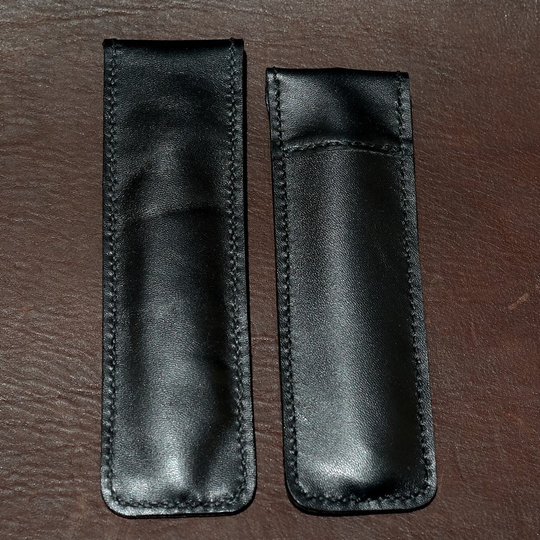 Но оборудования у меня нет, а несколько бритв без домов есть, что не очень хорошо. Увидел на "Авито" кожаный чехол, сработанный в Англии, подумал, что и мы такое можем, ну и.. Вот. Кнопки с бритвой не контачат, в одном чехле приклеена вставка изнутри , а в другом кнопка вообще вынесена на накладку. Мне нравится -))