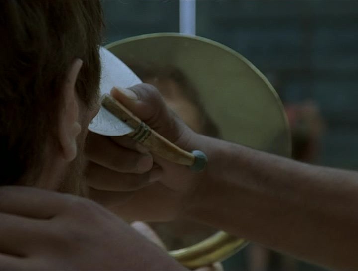 Re: Фильмы с участием опасной бритвы"Иисус. Бог и человек". Режиссер Роджер Янг, 1999 год. Бритье, а точнее- подбривание бородки Понтия Пилата (в исполнении Гарри Олдмена) римской бронзовой бритвой с использованием такого же зеркала.