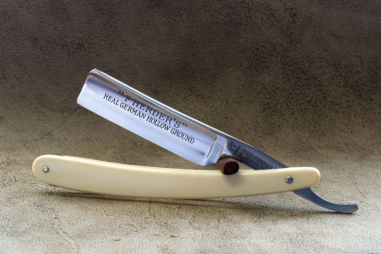 Бритва середины 20 века от одного из старейших немецких производителей Friedr. Herder. Ширина полотна – 20мм (6/8), полная вогнутость, пластиковая рукоять. 77 является наиболее массовой моделью от Фридриха Хердера, выпускавшейся в середине 20 века. Простой и лаконичный дизайн, хорошо подобранная сталь, все бритвы, данной модели, побывавшие у меня в руках имели хорошую геометрию. Бритва хоть и не новая но находится в прекрасном состоянии, отлично подойдет для новичка. Заточена и готова к бритью. Продано 77 Show