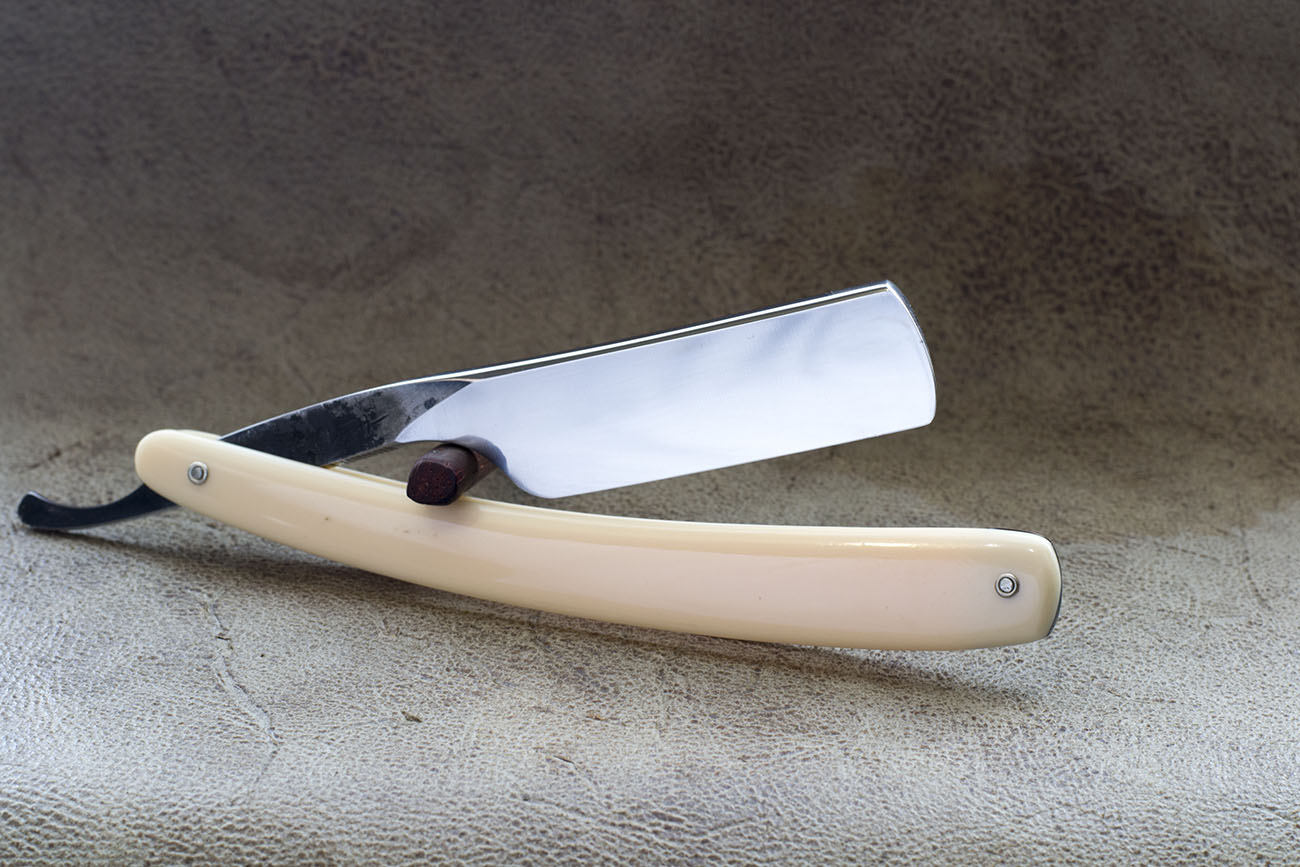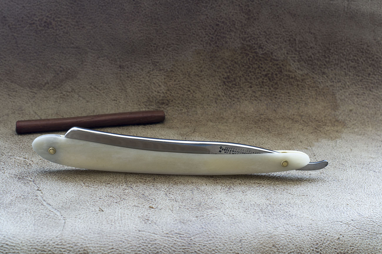 Опасная бритва начала 20 века, произведенная в Германии, очевидно в г. Золинген. Клеймо Alex Joseph Pitsburgh. PA скорее всего является дилерским. Бритва имеет крайне интересный парикмахерский вырез необычной формы, костяную рукоять свекольного цвета , причем кость пропитана довольно глубоко. В целом бритва создает очень приятное и необычное впечатление сочетанием необычной формы и яркой костяной рукоятью. Ширина полотна 18 мм (11/16), вогнутость ½. Прекрасно подойдет для новичка, так же интересна как предмет коллекции. Заточена и готова к бритью. продано Pitsburgh Show