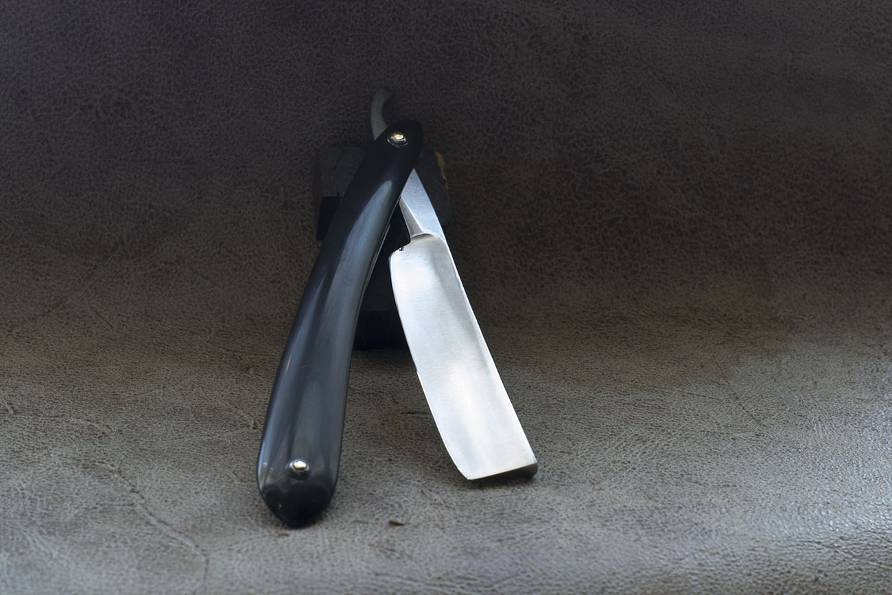 Миниатюрный, узкий полуклин от одного из известнейших производителей в Англии – Joseph Rodgers & Sons. Надпись на эрле свидетельствует о том, что Джозеф Роджерс являлся поставщиком Их Величеств Королей и Королев Англии. Хоть это и является лишь косвенным доказательством качества продукции данного производителя, но на деле все именно так – бритвы от Роджерса – прекрасны, сделаны из качественной углеродки, с завода имеют отличную геометрию, бреют чисто и мягко. Данная бритва получила новую рукоять из кости буйвола, имеет ширину в 5/8, вогнутость 1/2 , геометрия близка к заводской, фаска в районе режущей кромки тонкая и равномерная. Бритва прекрасно подойдет для окантовки усов, висков и бороды, а так же для бритья 1-3 дневной щетины. Заточена и готова к бритью. Продано Joseph Show