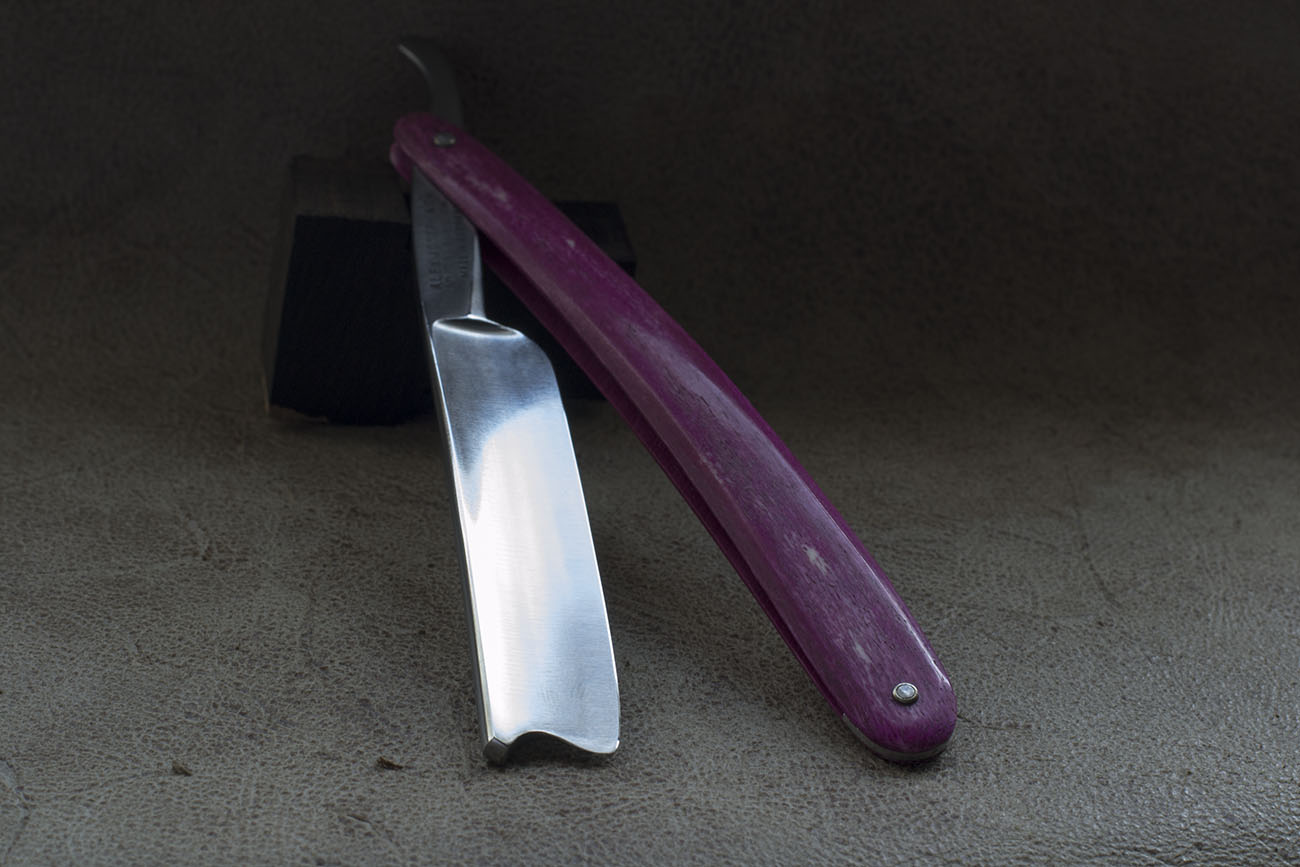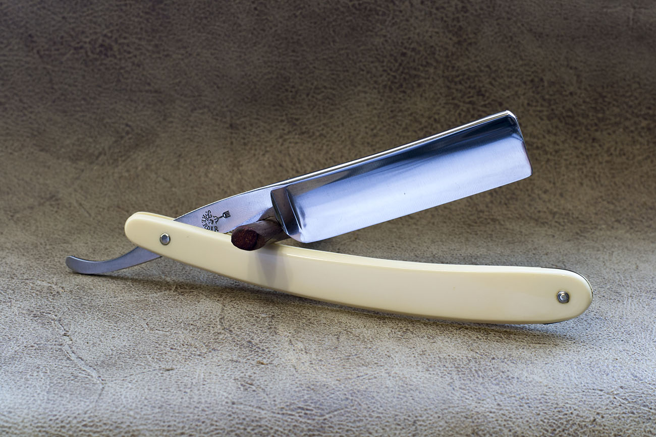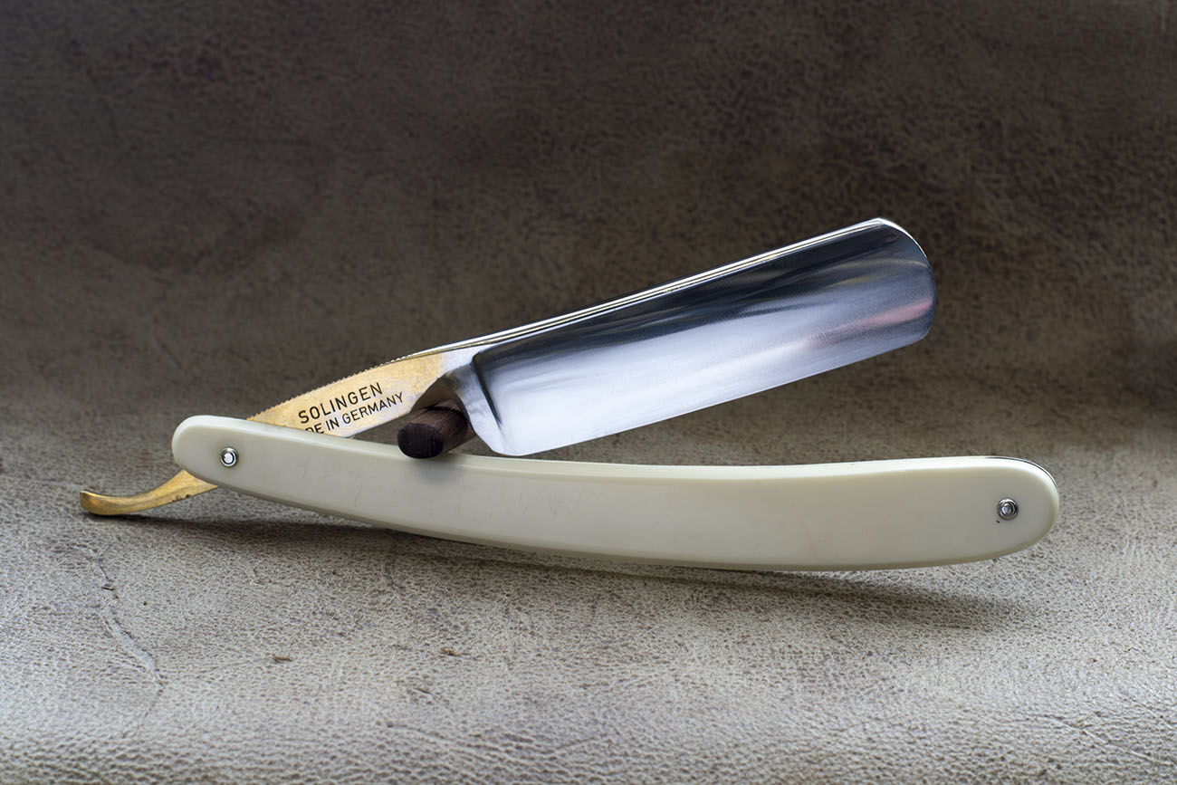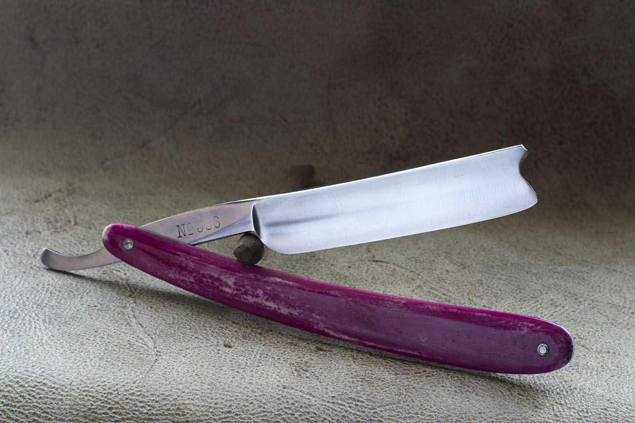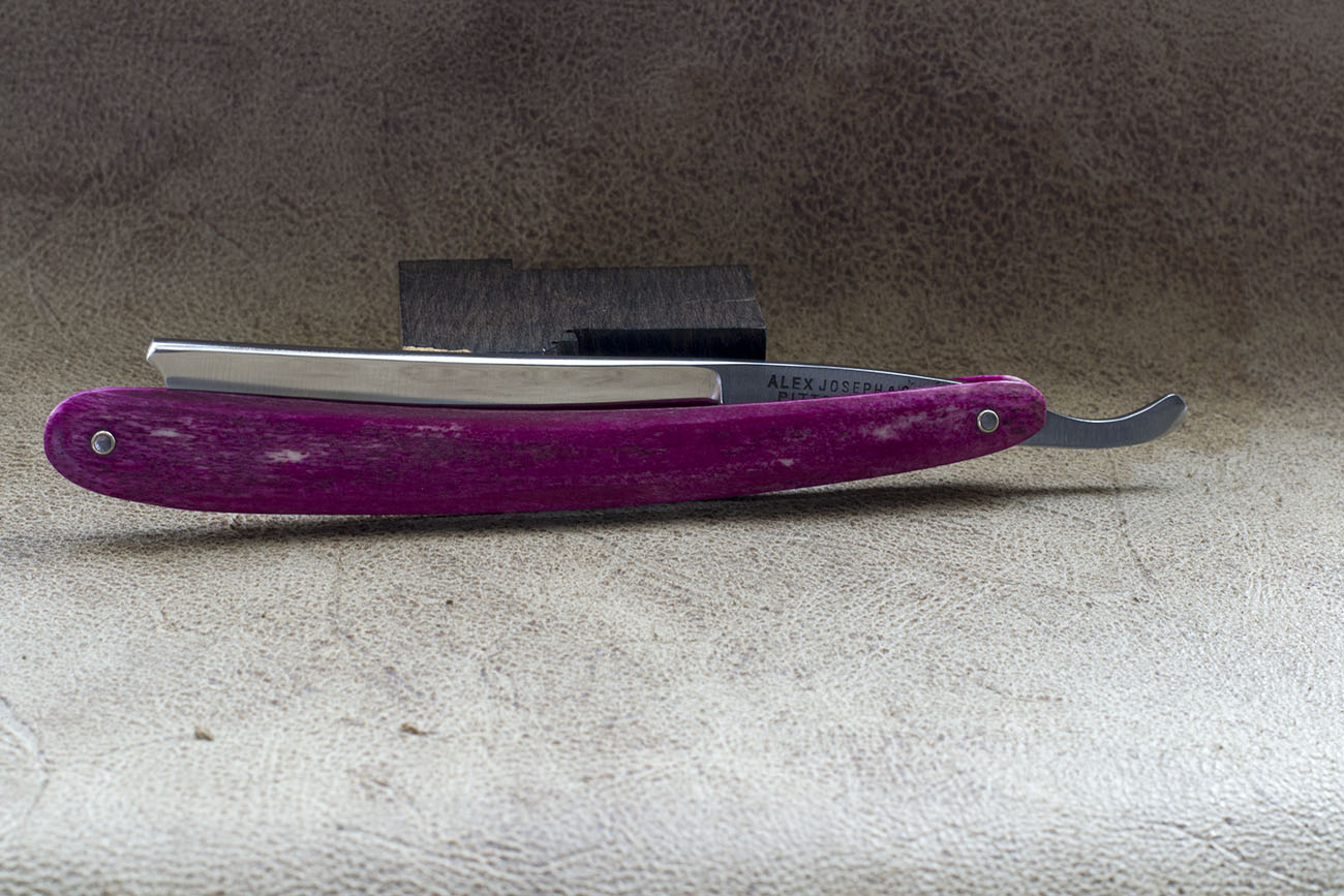 Опасная бритва начала 20 века, произведенная в Германии, очевидно в г. Золинген. Клеймо Alex Joseph Pitsburgh. PA скорее всего является дилерским. Бритва имеет крайне интересный парикмахерский вырез необычной формы, костяную рукоять свекольного цвета , причем кость пропитана довольно глубоко. В целом бритва создает очень приятное и необычное впечатление сочетанием необычной формы и яркой костяной рукоятью. Ширина полотна 18 мм (11/16), вогнутость ½. Прекрасно подойдет для новичка, так же интересна как предмет коллекции. Заточена и готова к бритью. продано Pitsburgh Show