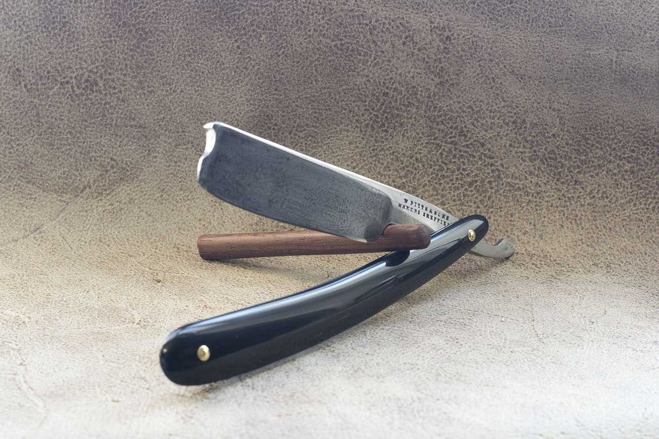 Ширина полотна 7/8 или 22 мм. Спинка 5.6 мм. Масонское травление довольно хорошо сохранилось. Очень интересная форма полотна – массивный и удобный эрль. Удалось сохранить правильную геометрию бритвы, не нанеся вред травлению. Сталь по качеству ничем не уступает стали более именитых и известных шеффилдских производителей. Так же стоит отметить парикмахерский вырез сделанный наискось и хвостовик сохранивший следы ковки в виде окалины на поверхности металла, придающие бритве особую аутентичность и уникальность. К сожалению, информация о производителе не доступна в открытых источниках в сети, кроме того я не нашел ни одной другой бритвы этого производителя, что говорит о малом тираже бритв W. Pitts. Судя по форме полотна и мотиву травления – бритва довольно древняя. 30-40 гг 19 века. Отличный подарок для коллекционеров. Продано Spoiler Show
