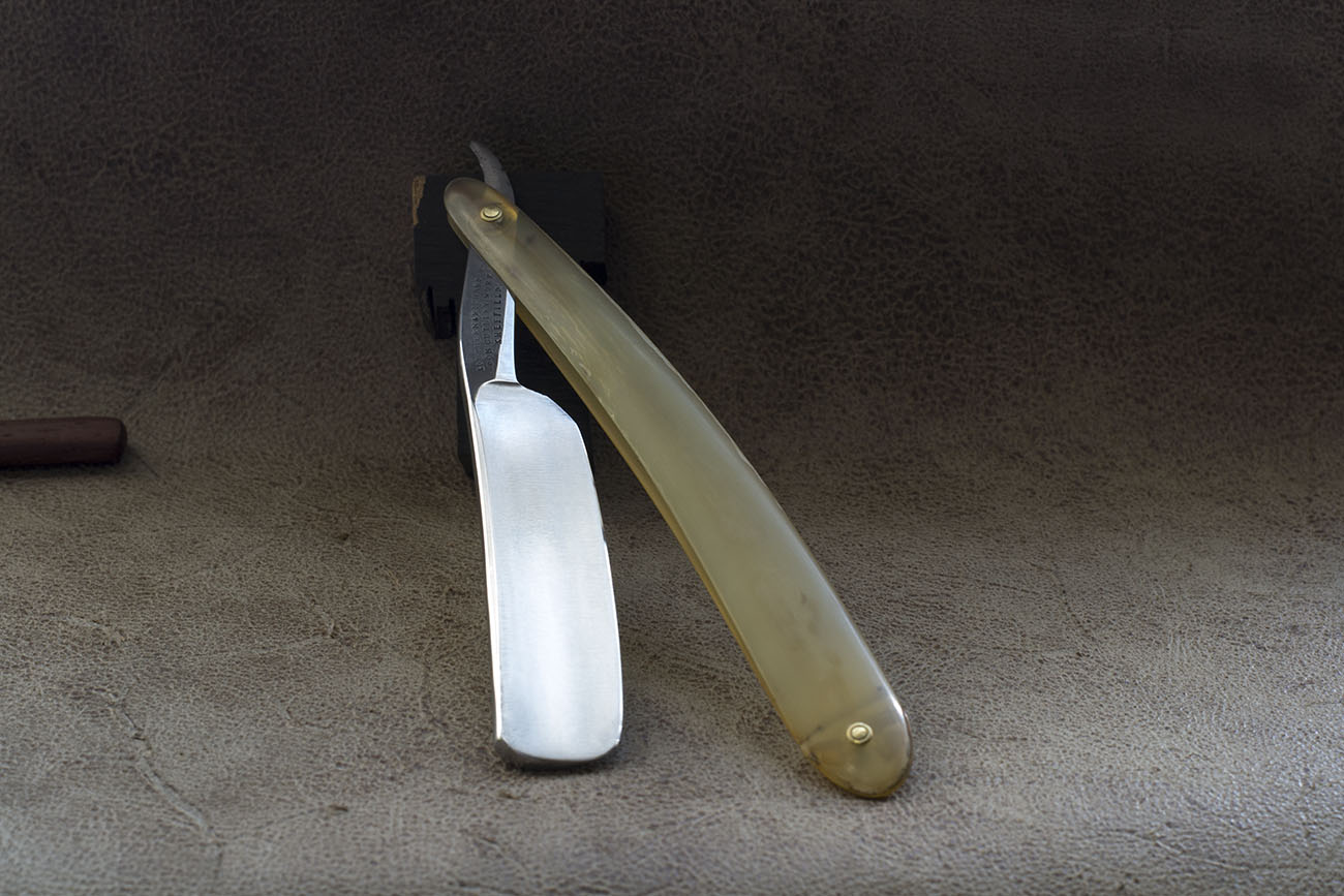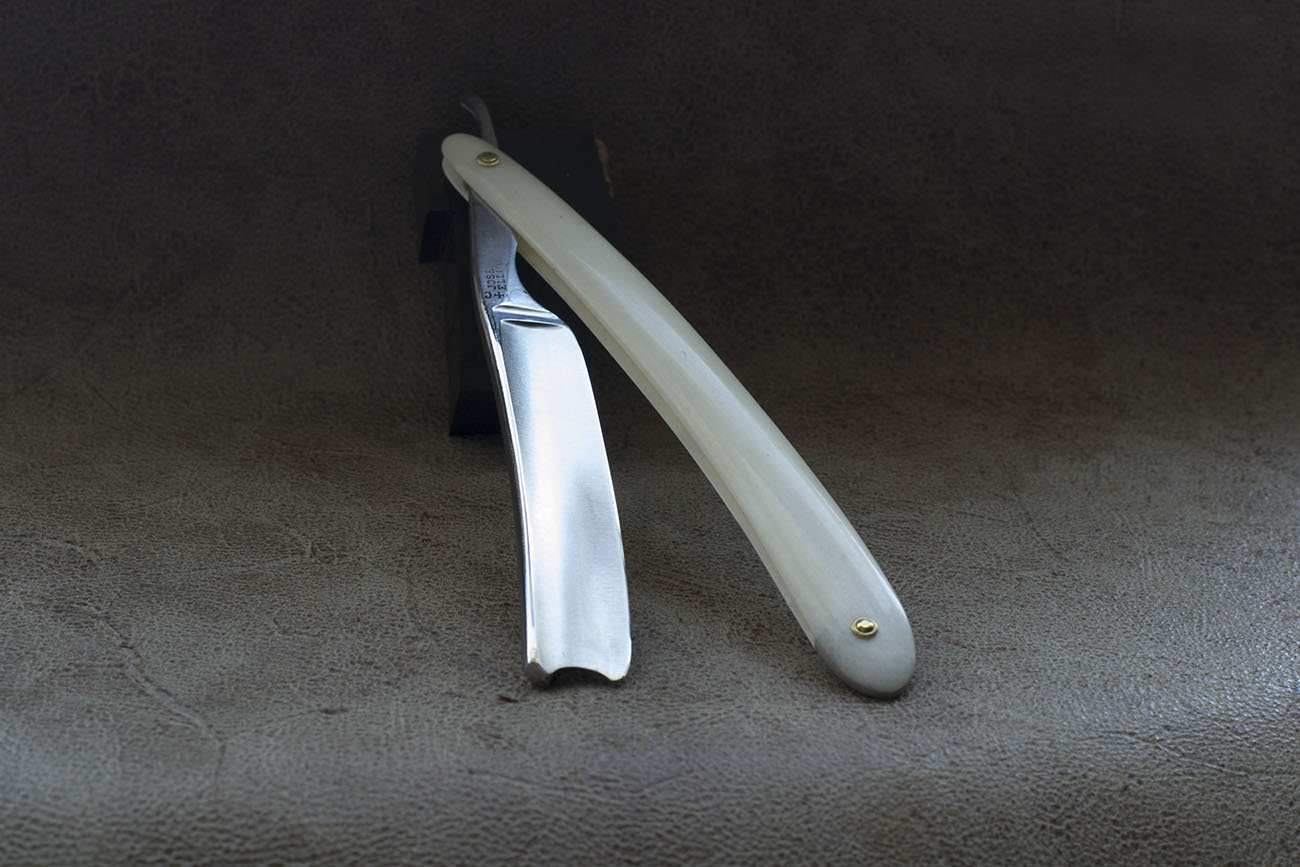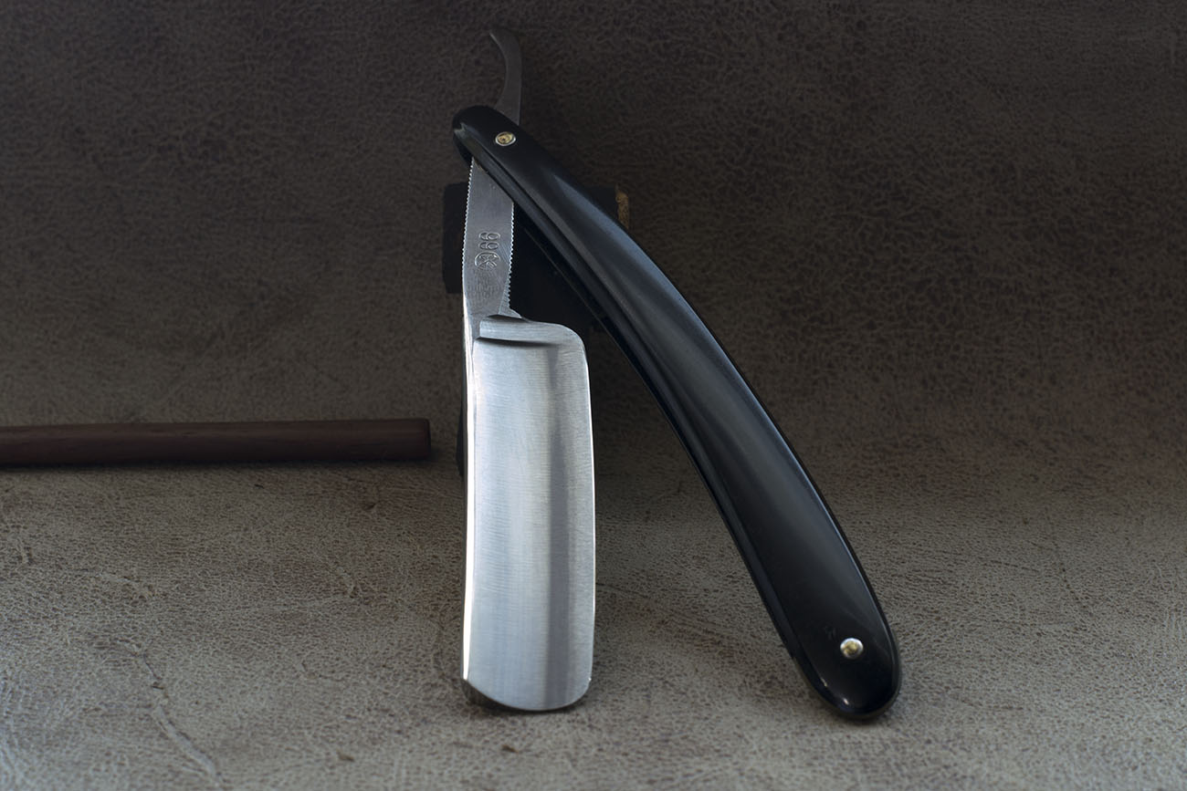 Миниатюрный, узкий полуклин от одного из известнейших производителей в Англии – Joseph Rodgers & Sons. Надпись на эрле свидетельствует о том, что Джозеф Роджерс являлся поставщиком Их Величеств Королей и Королев Англии. Хоть это и является лишь косвенным доказательством качества продукции данного производителя, но на деле все именно так – бритвы от Роджерса – прекрасны, сделаны из качественной углеродки, с завода имеют отличную геометрию, бреют чисто и мягко. Данная бритва получила новую рукоять из кости буйвола, имеет ширину в 5/8, вогнутость 1/2 , геометрия близка к заводской, фаска в районе режущей кромки тонкая и равномерная. Бритва прекрасно подойдет для окантовки усов, висков и бороды, а так же для бритья 1-3 дневной щетины. Заточена и готова к бритью. Продано Joseph Show