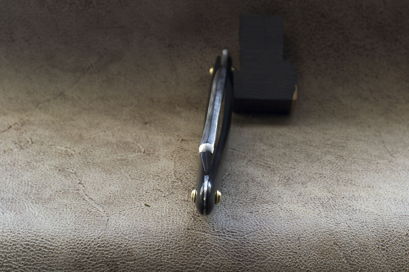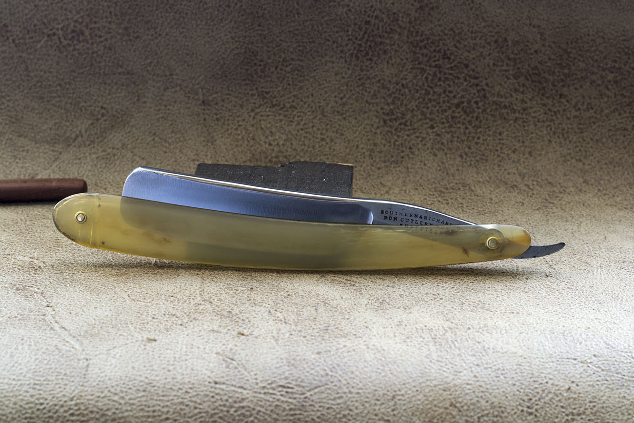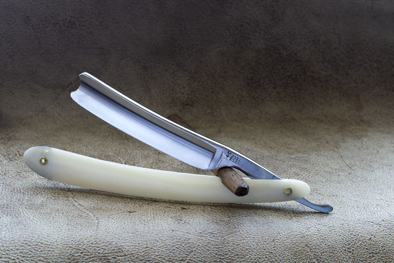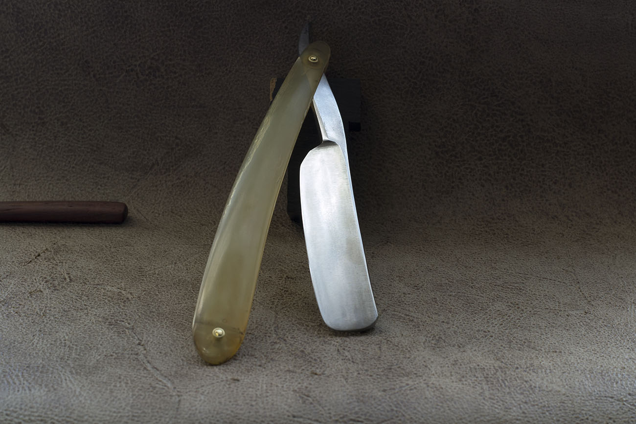 Миниатюрный, узкий полуклин от одного из известнейших производителей в Англии – Joseph Rodgers & Sons. Надпись на эрле свидетельствует о том, что Джозеф Роджерс являлся поставщиком Их Величеств Королей и Королев Англии. Хоть это и является лишь косвенным доказательством качества продукции данного производителя, но на деле все именно так – бритвы от Роджерса – прекрасны, сделаны из качественной углеродки, с завода имеют отличную геометрию, бреют чисто и мягко. Данная бритва получила новую рукоять из кости буйвола, имеет ширину в 5/8, вогнутость 1/2 , геометрия близка к заводской, фаска в районе режущей кромки тонкая и равномерная. Бритва прекрасно подойдет для окантовки усов, висков и бороды, а так же для бритья 1-3 дневной щетины. Заточена и готова к бритью. Продано Joseph Show