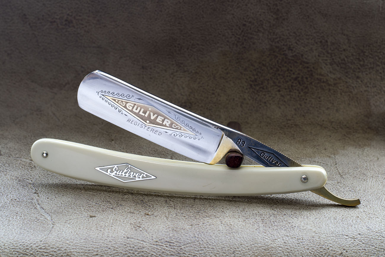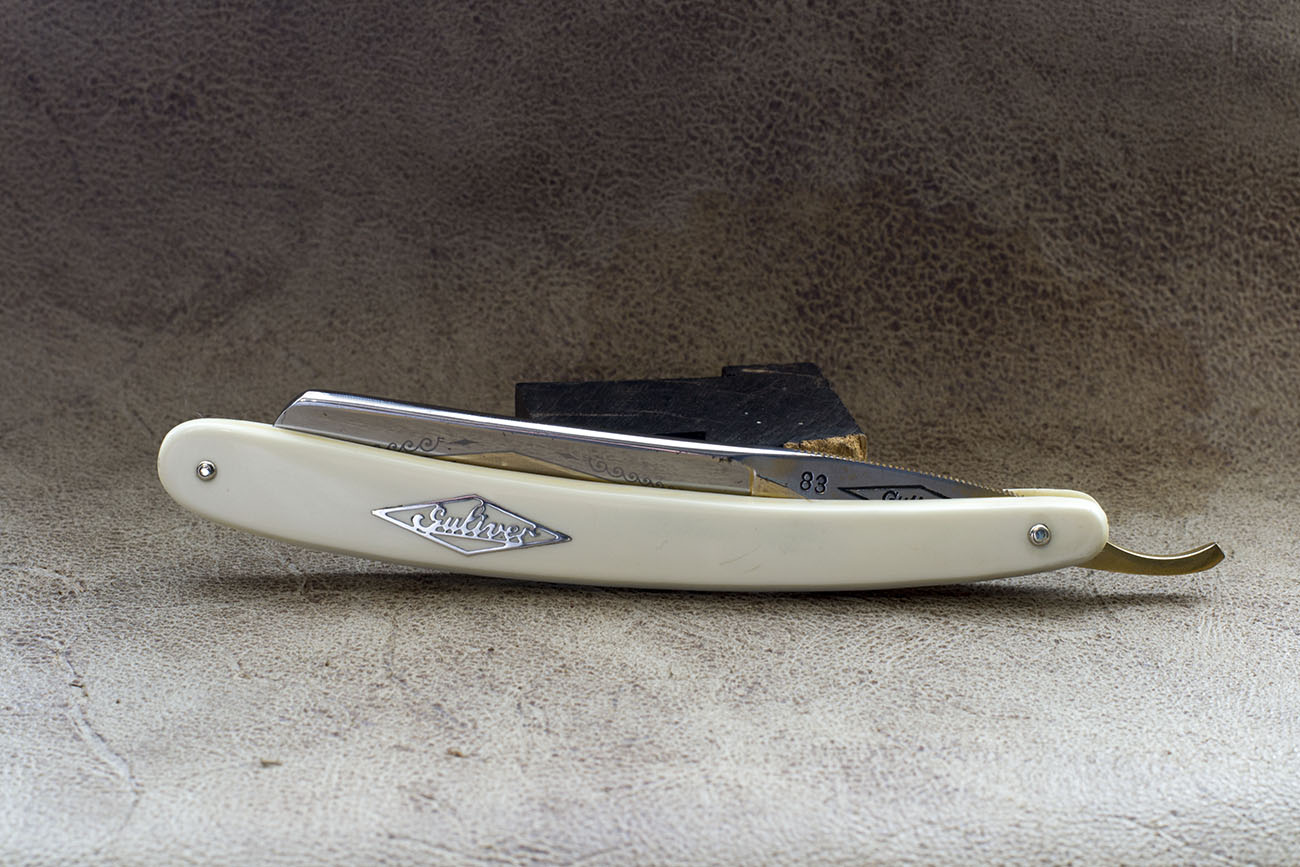 Немецкая опасная бритва середины 20 века, торговая марка Guliver принадлежала Paul Waldmin, довольно известному производителю режущего инструмента из Золингена. Ширина полотна 13/16 (21 мм.), полная вогнутость. Бритва находится в первозданном с завода виде, исключая естественные последствия длительного хранения – кое где отсутствует позолота и есть небольшие пятнышки окисления. Бритва имеет заводскую заточку, свидетельствующую о хорошей геометрии. Перед отправкой будет заточена по желанию клиента. Продано Guliver Show