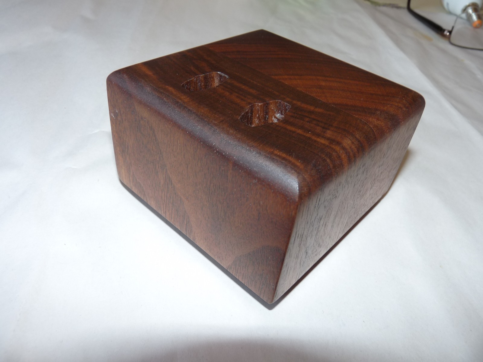 Как и предыдущая крышка для подставки этот предмет есть необязательный, но с креативным подходом. Так - шутка - скерцо, упорядочивание излишнего дерева в запасниках (а то куда его девать)... Выборки сделаны таким образом, чтобы помещались концы с пинами всех ручек бритв, которые у меня сейчас есть, то есть выборки универсальные. Материал - орех (не знаю какой) - из обрезка склеенной из 2х частей балки. И как всегда - даниш + воск. И опять же - не знал, что сделать с этим кусочком дерева и сделал это. Можно использовать как подставку для сушки бритв после использования (что я и делаю) или как некую подставку - как "витринку" для пары бритв, ну, например чтоб фотать эти бритвы было удобнее. Ну в общем, некая безделица. PS Вот не знаю теперь - клеить на низ фетр или пену "КОФЕ", или ничего не клеить, мнения есть?
