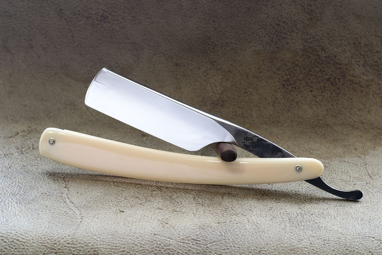 Опасная бритва, изготовленная из YSS – специальной стали Ясуки. Судя по всему бритва могла быть выполнена из стали aogami или shirogami (Голубая или белая стали соответственно) Бритва является качественным продуктом производства Японии середины 20 века, имеет отличную геометрию, ширину 6/8 и рукоять из желтого полупрозрачного пластика. Бритва заточена и готова к бритью, прекрасно подойдет новичку. Продано YSS Show