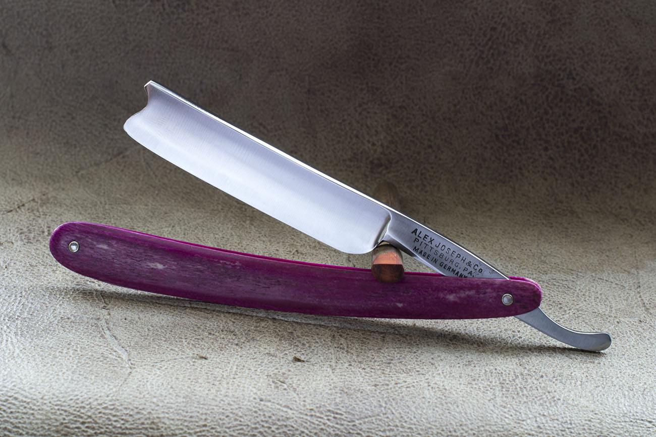 Опасная бритва начала 20 века, произведенная в Германии, очевидно в г. Золинген. Клеймо Alex Joseph Pitsburgh. PA скорее всего является дилерским. Бритва имеет крайне интересный парикмахерский вырез необычной формы, костяную рукоять свекольного цвета , причем кость пропитана довольно глубоко. В целом бритва создает очень приятное и необычное впечатление сочетанием необычной формы и яркой костяной рукоятью. Ширина полотна 18 мм (11/16), вогнутость ½. Прекрасно подойдет для новичка, так же интересна как предмет коллекции. Заточена и готова к бритью. продано Pitsburgh Show