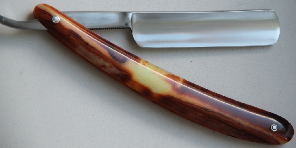 Ширина полотна-20.5 мм Толщина обушка-5.2 мм Полная вогнутость. Углеродистая сталь. Середина 20-го века. Бритва в очень хорошем состоянии,с минимальными следами использования.Не разбиралась. Только немного почистил полотно от древней патины. Сталь и кромка чистые, без проблем.Красивая, трех-пиновая пластиковая оправа.Заточена и готова к бритью.Будет неплохим вариантом для новичка. Цена-4800 р с доставкой.ПРОДАН Spoiler Show