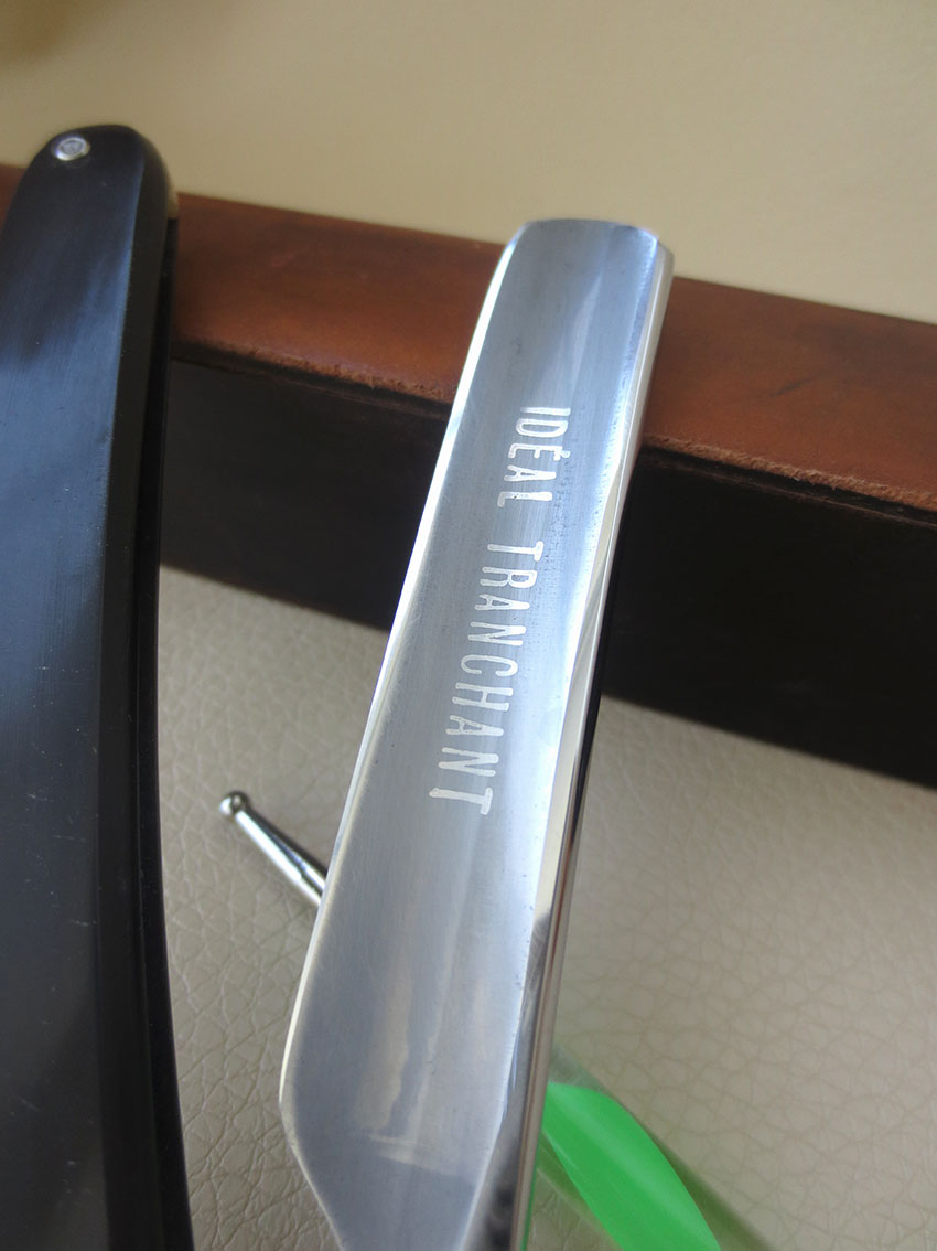 На полотне бритвы, можно разглядеть под наклоном, написано - souvenir de la guerre - Помните войну. Fr Show Бесит, когда приходится пользоваться бритвой моложе себя...