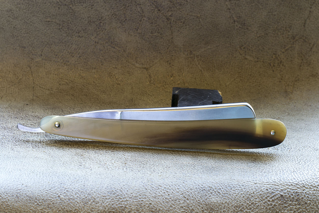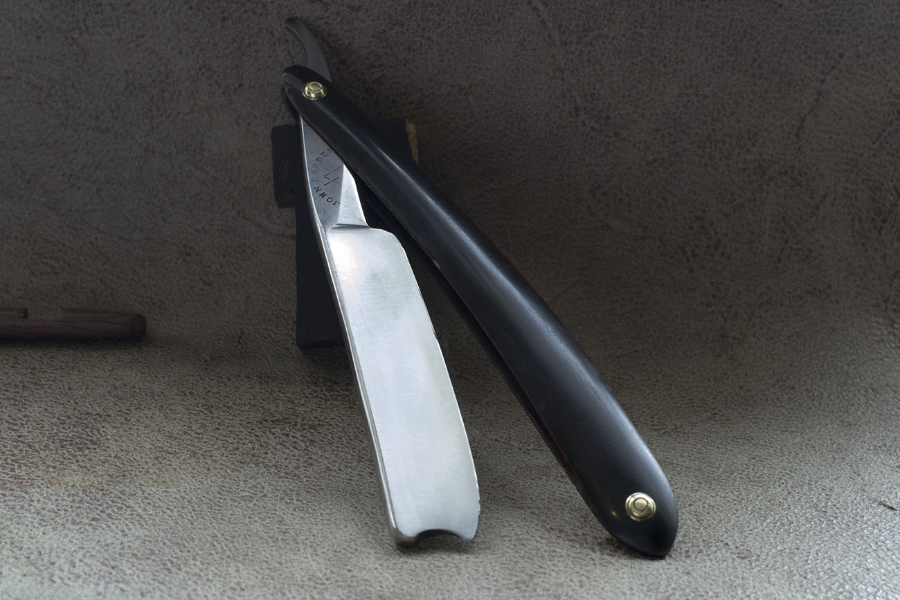 Опасная бритва от знаменитого шеффилдского производителя George Wostenholm & Sons марки IXL. Марка IXL принадлежала семье с середины 1830-х, а фабрика Washington Works с конца 50-х, судя по форме клинка и вогнутости бритвы в ¾ рискну предположить, что бритва была изготовлена в 60-х годах 19 века. Клинок имеет отличную геометрию, полотно плавно расширяется к носику и максимальная ширина достигает 22 мм. (7/8), спинка в самом широком месте имеет ширину в 6 мм, создавая оптимальный угол заточки на протяжении всей режущей кромки. Бритва получила новую рукоять из кости буйвола. Заточена и готова к бритью. Отличный выбор для коллекционеров. Продано Wostenholm Show