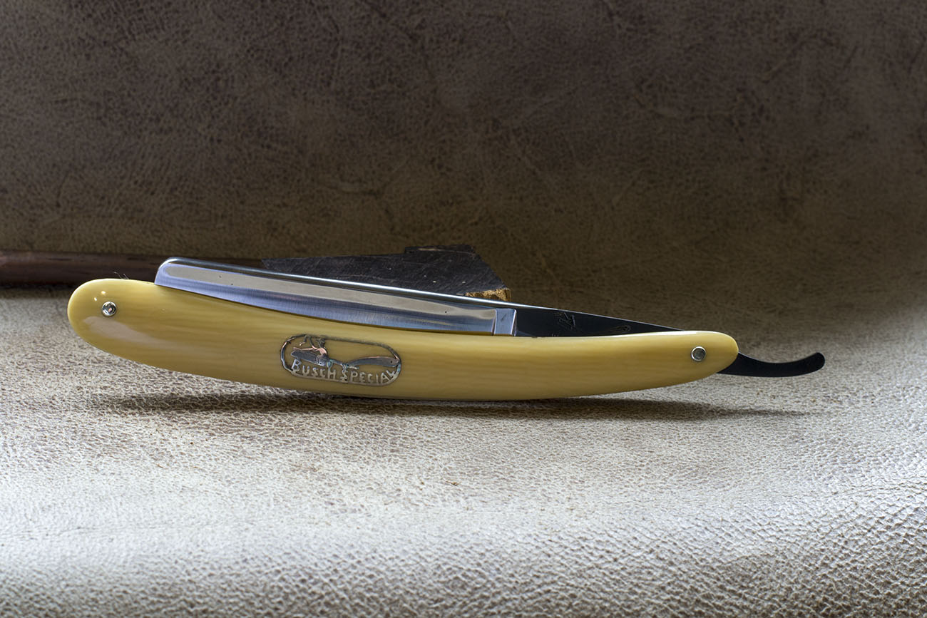 Опасная бритва от одного из известнейших производителей в Германии - Otto Busch. За данной фабрикой было закреплено множество торговых марок - наиболее известные из них - 'World Master' и 'Weltmeister'. Под данными брендами выпускалось подавляющее большинство опасных бритв данного производителя, марка Busch гораздо реже, не говоря об остальных крайне редких брендах фабрики. Данная бритва - Bush Special является действительно крайне редким экземпляром. За многие годы коллекционирования и увлечения бритвами, встречаю такую впервые, так же не нашел вторую такую при поисках в сети. Ширина полотна 21 мм (13/16), вогнутость полная, рукоять из целлулоида. Бритва имеет заводское воронение на эрле, спинке и носике, не разбиралась. Немного почистил вогнутые части полотна и заточил, признаков использования не замечено, скорее всего, не был в использовании. Наездник на бритве так же является зарегистрированной товарной маркой фабрики - Жокей. Так же интересным является то, что фабрика основанная в конце 19 века, до сих пор продолжает существовать под маркой Weltmaster. Она выпускает несколько опасных бритв из нержи и другой парикмахерский инструмент. Продано. Otto Show