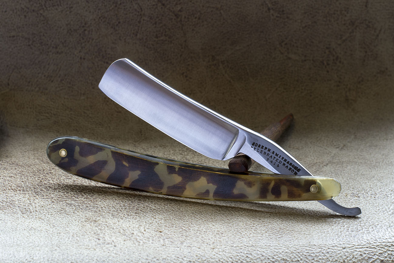 Опасная бритва от Джозефа Смитта и сыновей. Бритва изготовлена в середине 19 века, ориентировочно в 60-70 хх годах. Полная вогнутость, рукоять из травленого под черепаху рога. К сожалению, полотно досталось мне в слегка укороченном виде. Я предполагаю, что изначально оно было длиннее на 4-5 мм. Мне оставалось только укоротить рукоять, немного почистить и заточить бритву. Теперь это отличный вариант для новичка. Цена снижена, а потребительские качества остаются практически неизменными, так как невозможно использовать всю длину стандартного полотна при бритье, всегда какая та часть режущей кромки не касается кожи и соответственно не сбривает щетину. Ширина полотна 20 мм (6/8+). Бритва заточена и готова к бритью. Продано Smith Show