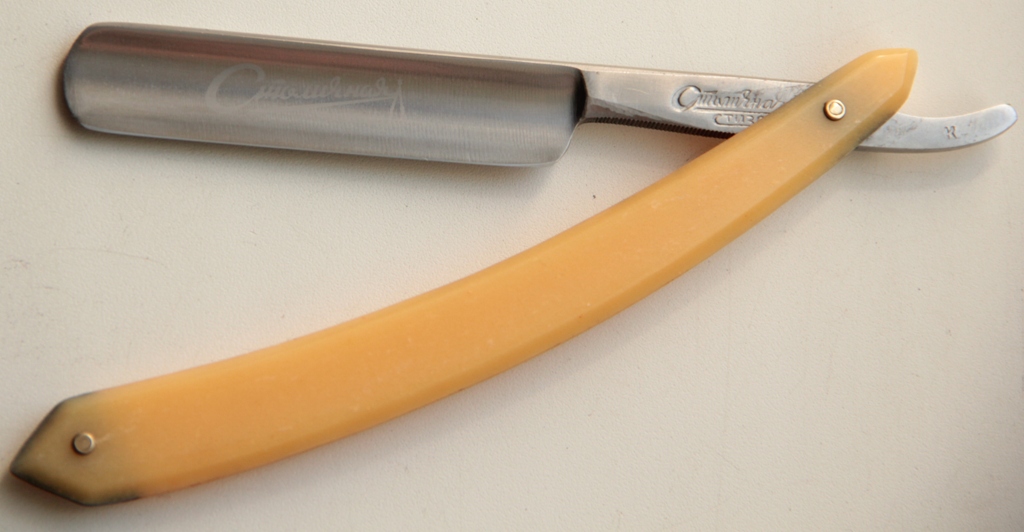 Ширина полотна-20.5 мм Толщина обушка-5.2 мм Полная вогнутость. Углеродистая сталь. Середина 20-го века. Бритва в очень хорошем состоянии,с минимальными следами использования.Не разбиралась. Только немного почистил полотно от древней патины. Сталь и кромка чистые, без проблем.Красивая, трех-пиновая пластиковая оправа.Заточена и готова к бритью.Будет неплохим вариантом для новичка. Цена-4800 р с доставкой.ПРОДАН Spoiler Show