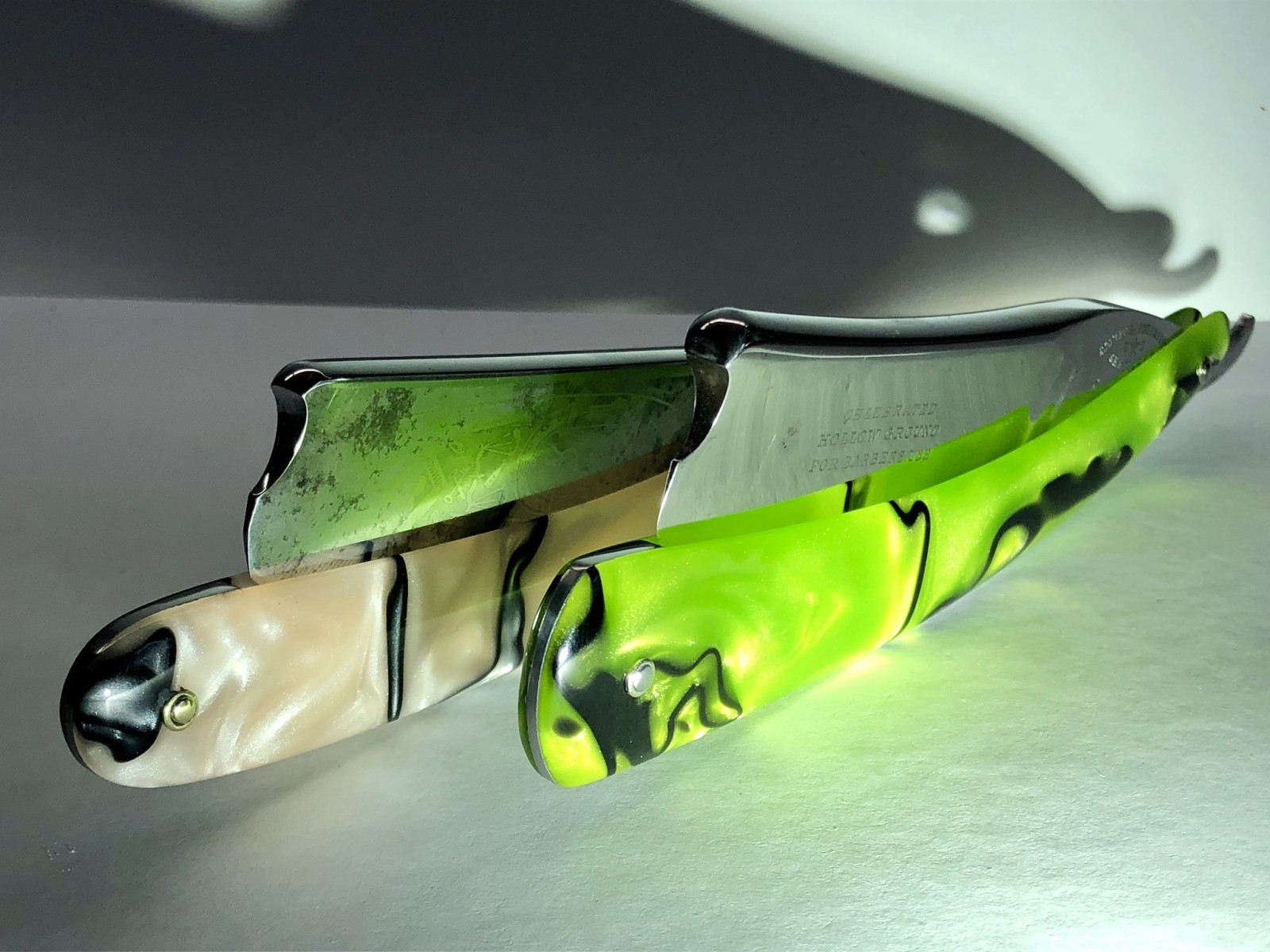 Re: Ручка (оправа) бритвы - изготовление/ремонтНасмотрелся последнее время на рукояти Алексея, исполнение конечно на уровне - отличная полировка, хорошее соблюдение классических форм, но вся беда на мой взгляд кроется в том - что формы классические а материал новый, с непонятными цветами, переливами, словно смотришь на сопли пришельца, смешанные с чернилами каракатицы, посыпанные металлической стружкой, при всем при этом - видишь родной аглицкий клин с рукоятью подобающей формы и эти странные цвета, такое должно нравиться поклонникам грибов, трав, и ударных доз алкоголя, у остальных это вызывает когнитивный диссонанс. Материалы конечно имеют место быть но на рукоятях других форм и желательно на новых кастомных бритвах.