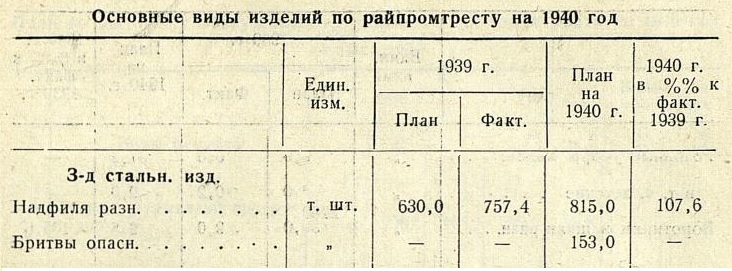 Цех по производству опасных бритв введен в строй в 1939 году, однако, судя по табличке, бритв не произведено, только в плане стоит 153 тысячи на 1940 год.