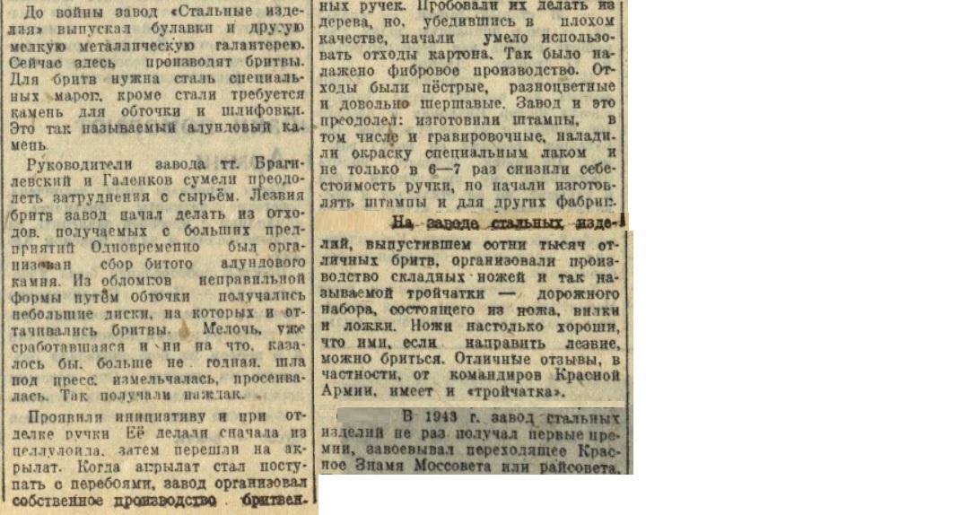 До войны завод «Стальные изделия» выпускал булавки и другую мелкую металлическую галантерею. Сейчас здесь производят бритвы. Для бритв нужна сталь специальных марок, кроме стали требуется камень для обточки и шлифовки. Это так называемый алундовый камень. Руководители завода тт. Брагилевский и Галенков сумели преодолеть затруднения с сырьём.