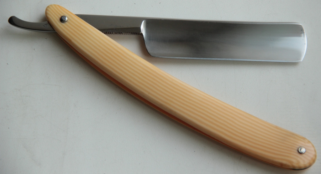 Бритва в прекрасном состоянии. По всей видимости в употреблении не была. Не разбиралась и не ремонтировалась.Крупная, мощная, но в тоже время по французски элегантная бритва, с отличной сталью и удобной формой лезвия.Идеальная геометрия полотна. Кромочка равномерна по всей длине и еле заметна. Сталь чистая, без проблем.Очень красивая бритва не оставит равнодушным никого. Заточена и готова к пользованию.