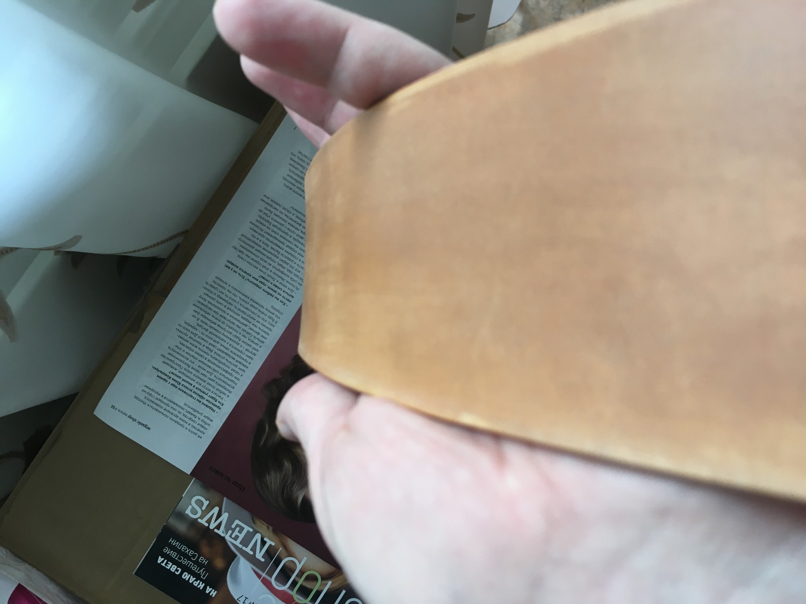 Цвет ремня не равномерный по всей длине. Упругость так же не равномерная, поэтому при правке звук бритвы меняется в зависимости от места работы на ремне, плюс жёлоб заставляет к ремню прикладывать бОльшее усилие. В целом ремень могу рекомендовать вероятно новичкам, готовым доработать изделие, т.к. уверен, что все эти недочеты (на мой взгляд) можно исправить самому, а так же какие-то уйдут со временем. Как ремень для правки на длительное и постоянное использование не рекомендую, т.к. ни эстетического, ни тактильного удовольствия ремень не приносит. Касательно продавца никаких нареканий нет, все быстро, четко и по делу. Упаковка отличая.. В дальнейшем обещали возможность ставить клеймо на такие ремни. Ибо на мой взгляд клеймо обязано стоять на всяком изделии мастера, как его знак качества.