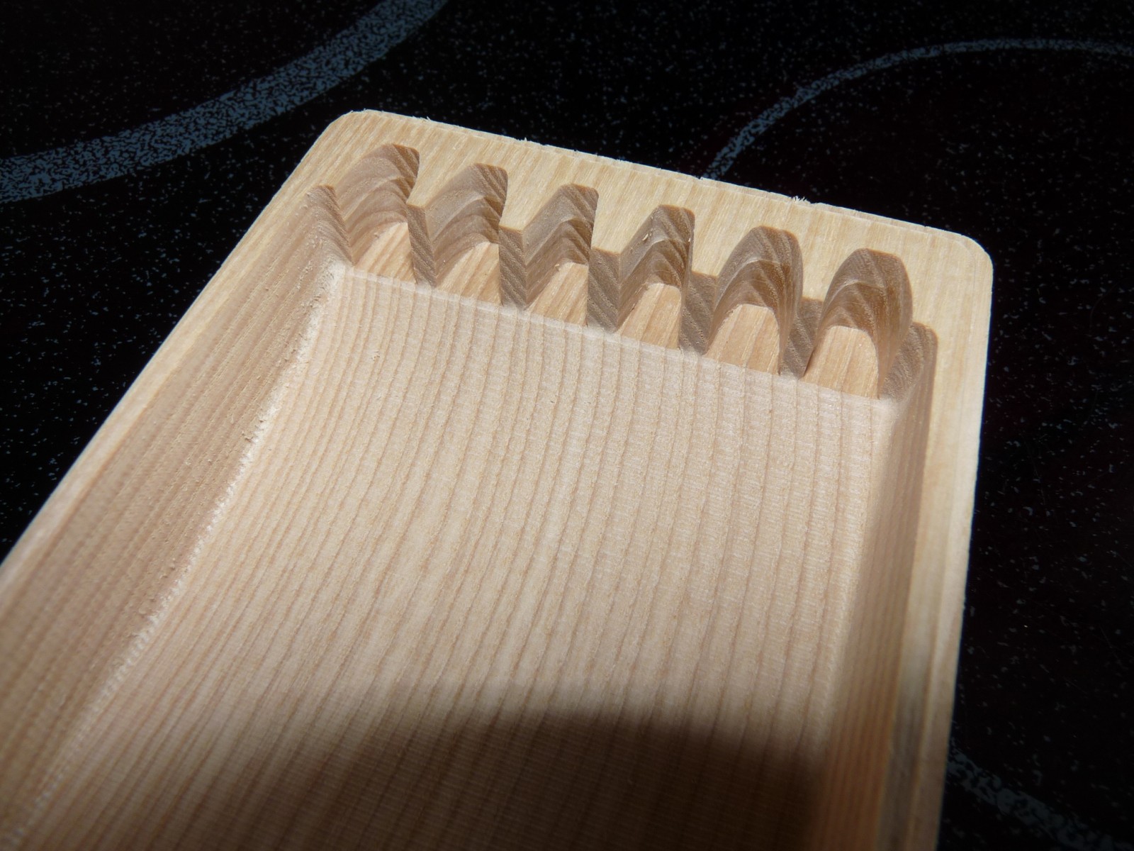 Кофрик на 6 бритв, 3 побольше (ручка - 145мм) + 3 поменьше (ручка - 140мм). Дерево - ясень. Высота рельефа бритовки - 2,538мм по нижнему пину. Примерил бритовки, спецом взял 5 черных и 1 белую, ибо фетр взял черный (гурманю тут вишь ли Кофрик вышел чуть уже и чуть длиннее дубовой "недельки", что была выложена выше, зато вырезы под хвосты для нижних пинов были увеличены для того чтобы могли влезать кроме утончённых слоновых хвостов англов и советских в расцвете бритв. Да и длина под ручки тоже немного больше. Но всё же это 5/8 и 6/8, однако 4/8 там утонут - не пойдут. Предотпускной каприз эдакий. Золотое сечение... PS фетр просто вставлен, не закреплён, ибо ещё не доработано. последнее фото - те самые вырезы (ещё не ошкурено) - видна ступенька - верх обработан конической фрезой, книзу - обычная сферическая цилиндрическая. И разные размеры вырезов - с краёв побольше, к центру поменьше - симметрия... И виден рельеф дна короба - тоже рельефная выборка, повторяющая изгиб ручки бритвы. Кстати рельеф дна, как и рельеф крышки изнутри можно сделать тоже волнистым - бритва как бы лежит на дне волны и волной (крышки) прикрывается Ну понятно, что волна крышки будучи прикрыта фетром будет выглядеть как волна фетра... (волна вдоль ручки бритв - 6 бритв = 5 волн + 2 полуволны, объединённые со стенками), для удобства фиксации бритв в закрытом положении коробки, ну и для красоты для (или это излишне?). PSS Кстати,футлярчик из сушёного ясеня с шестью моими бритвами и фетром весит 501грамм, без бритв = 230грамм. При этом это вес до обработки маслом.