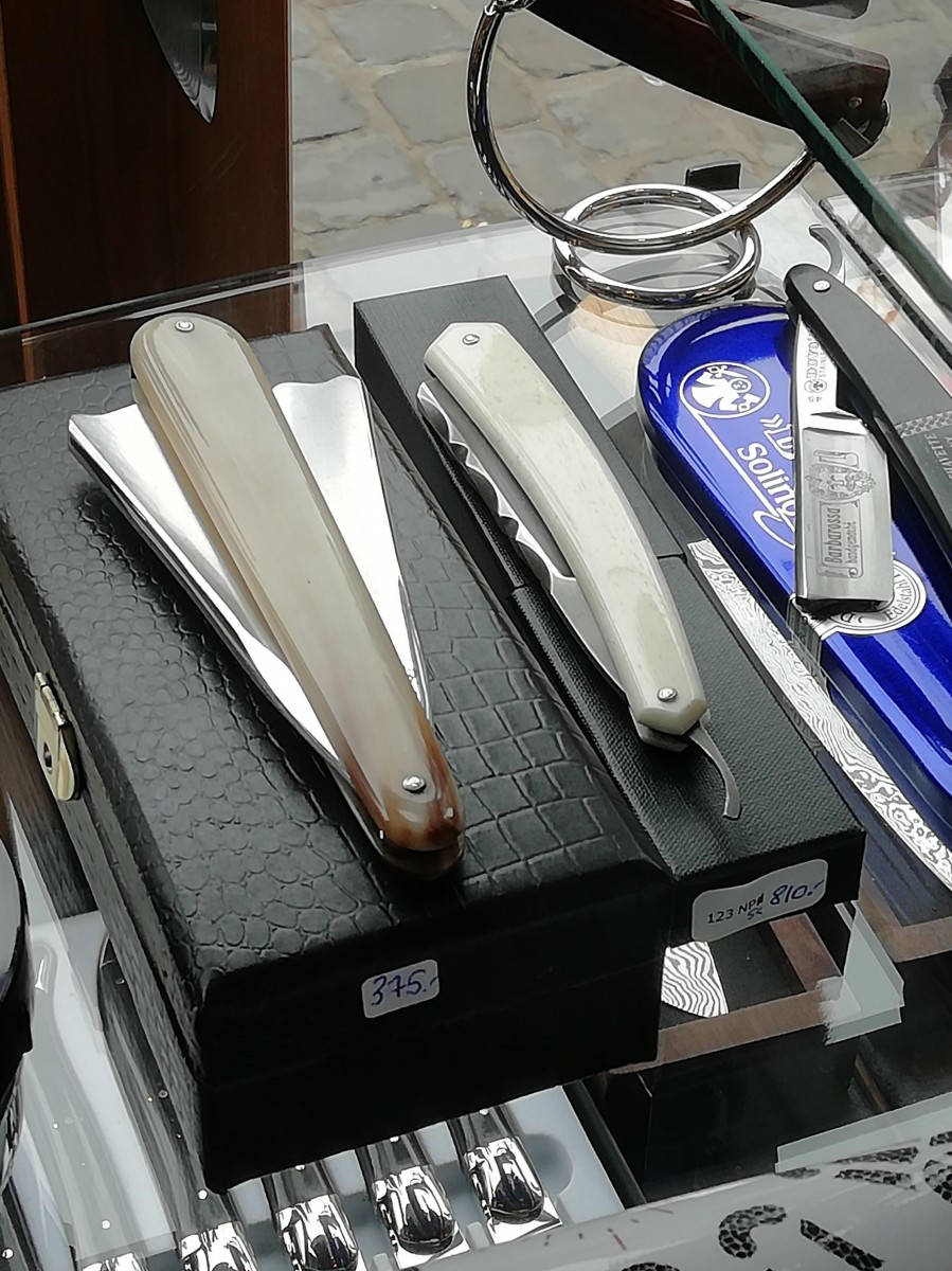 там ниже ещё пару фоток вставил от другого магаза с бритвами, но там ничего особого, вот только та, с белой ручкой за 1тр Евро, а ниже за бокер 5/8 дамаск - 750евр хотел мужик - ни на английском, итальянском, на мычит, даж на французском без прононса не мычит, козл.(может фламандец)..  У него там видно на фото - ножички перламутровые говорит, что собирает (коллекция) и их не продаёт несколько сот их там лежит...