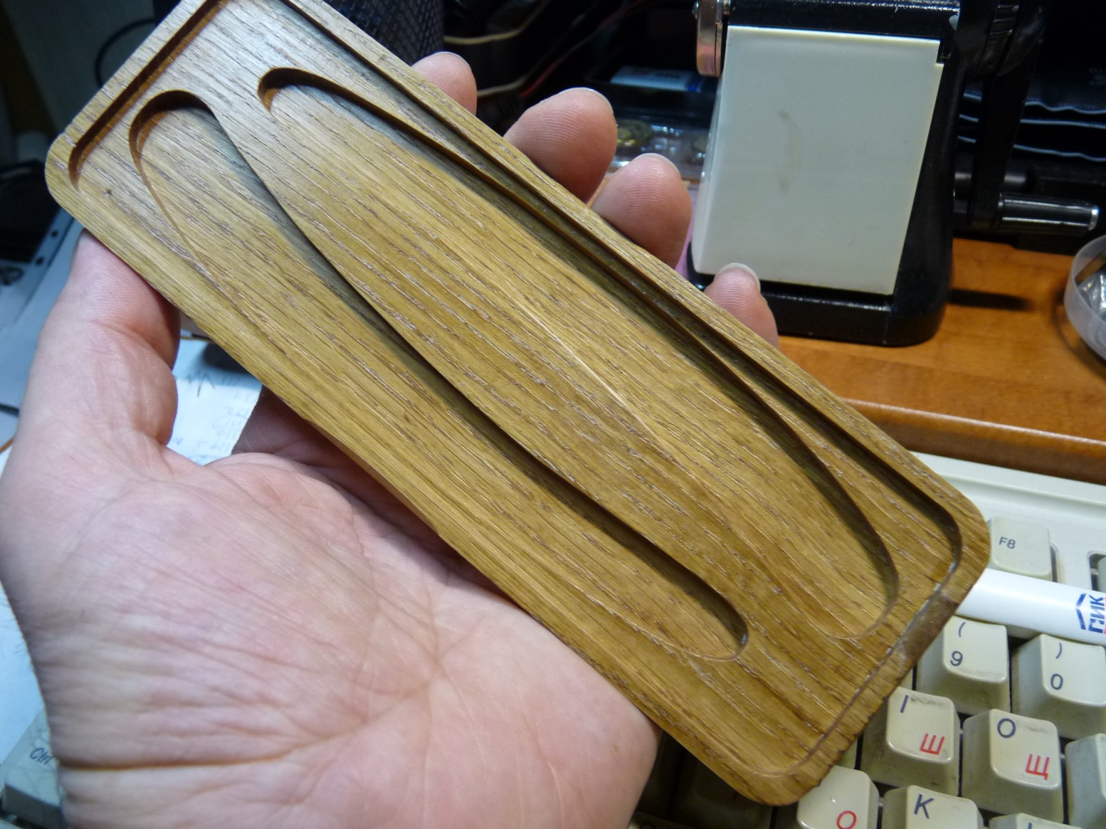 Наверняка, приятно и в руках держать, особенно сделанное своими руками... Можно было еще выемку под пальцы на нижней части сделать, типа , как на фото ниже. Кстати если на этом фото заменить ручки на бритвы, то получился бы отличный футляр-дисплей для хранения набора-недельки. Бесит, когда приходится пользоваться бритвой моложе себя...