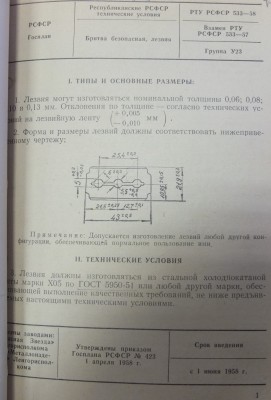 Открыл ГОСТ 1955 года и РТУ 1958 на лезвия. ГОСТ на бритвы лежит здесь: viewtopic.php?p=184298#p184298 получается: - сталь одинаковая - Х05 - угол заточки бритвы - 13-19 градусов - угол заточки лезвия - 17-23 градусов - твердость бритвы - 56-62 R - твердость лезвия - 57-63 R - и лезвия и бритвы проверяются "тестом на волос" По углу есть пересечение 17-19. Чем лезвие не бритва? При большом желании можно сделать державку, рассчитав ширину обуха и довести лезвие на камне до более острого угла в 13-16 градусов. Сталь то одинаковая. Вставил в шаветку, вот тебе и фрейм.... нет?