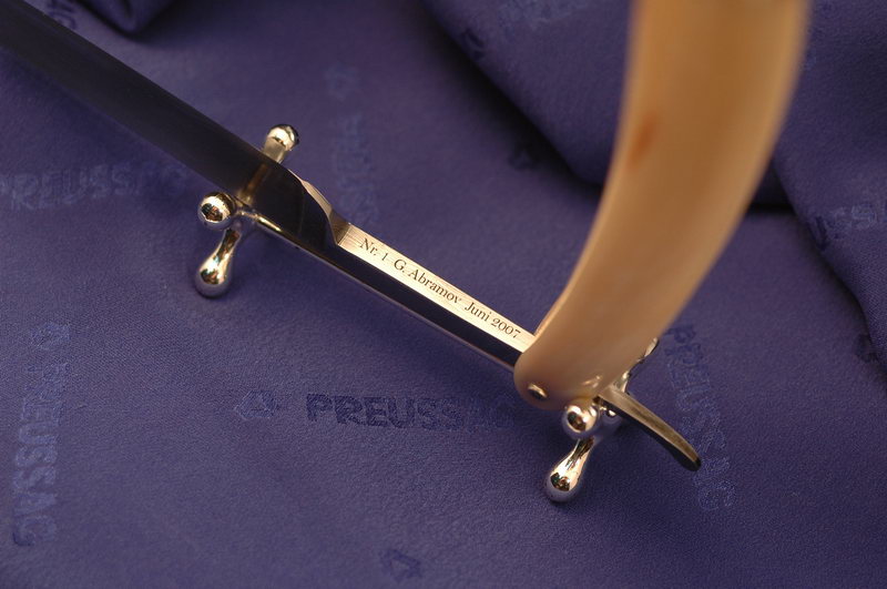 "Ширина полотна 5/8", вогнутость 1/1, испанская форма лезвия. Уникальный экземпляр изготовленный совместно российскими и немецкими мастерами, специально по заказу фирмы Exporter Solingen. Дамасская сталь, изготовленная в России содержит около 700 слоев. Бритва выполнена по заказу известным немецким мастером Wacker г.Золинген. Аналогов на сегодняшний день не имеется. Бритва в единственном экземпляре. Это продукт совместно русских и немецких мастеров. Ручка выполнена из отборного бразильского рога. Дата изготовления: Июнь 2007г." Это ответ Г.Абрамова мне. Чесслово не было желания обходить, просто Вакер доказывает своим поведением - правды нет. Для характеристики облика даю инфо из личной жизни: Этот человек в 2002 году пришёл со мной в известный магазин "Басселард" (www.knife.ru). И когда нам по блату показали короткий русский мечь из булата, спросил цену. Ему ответили: пять тысяч. У меня от качества и редкости аж дух перехватило. Когда мы вышли он говорит - куплю и подарю одному челу в Золингене. Я говорю - пять тысяч баксов в подарок?! Он отвечает, каких баксов - это ж рубли? Потом он пришёл домой, позвонил, спросил, убедился что был прав я... Он был удивлён ценой... Этот человек способен на чудо????!!!! Никогда не поверю, это очередная фишка! Как эта тема там называется? Во-во и я о том же...