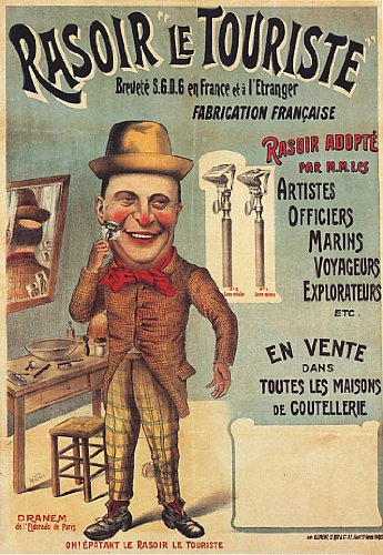 На плакате изображен французский комик и актер того времени Dranem. https://en.wikipedia.org/wiki/Dranem Это сценическое имя он придумал 1894 году. Так что бритва выпущена не ранее этого времени и 1905 год вполне приемлем. Re: Le Tourist the Single Edge RazorА вот и производитель.