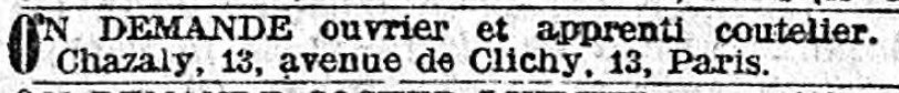 Возможно действительно не крупного масштаба парижский бизнес. Или появился перед/после Первой мировой. Проверил, во втором томе монографии Camille Pagé (раздел про современных автору производителей, 1896 год) эта фамилия в алфавитном индексе не встречается. https://gallica.bnf.fr/ark:/12148/bpt6k ... texteImage Но вообще, судя по этим алфавитным индексам, фамилия редкая. Там часто можно увидеть по 3-4 представителя с одной фамилией. А Дюма - так вообще 7 вариантов! Dumas (Paris), 238 Dumas, - (Thiers), 264 Dumas-Dumas, id. 270 Dumas-Girard, id. 266,267 Dumas et Girard, id. 165,266,269 Louis Dumas et Gic, id. 266 Dumas-Pradel, id. 269 Что за бритва?В 1915 году было объявление в газете Le Matin (Paris) от 21-06-1915 о найме на работу ученика (подмастерья) для ножовщика. Объявление разместил новый владелец этого магазина-мастерской