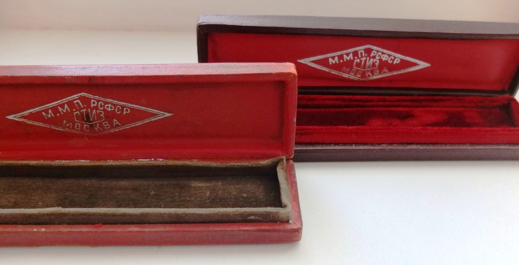 Для сравнения "Москва" 1946 года и 1951го. Бритвы отличаются только наличием электролитической направки у более позденй и материалом ручки. Такая направка в 1955 году будет отражена в ГОСТе 7126-54. Коробочка 1951 года по размерам осталась прежней, но пропал бархат из внутренней отделки и стенки коробочки стали в два раза тольше. В дальнейшем, в 1955 году и позже, коробочки стали короче на полтора сантиметра и полностью картонные.