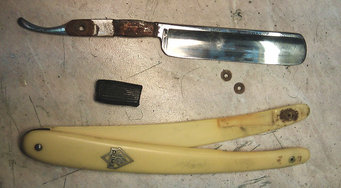 Да и в разобранном виде фото готовой не сделал... Но, уверяю, всё на совесть, от ржи нет следа... Пины поставил по старинному рецепту... Ремонт опасных бритв, звонить с 11-00 до 23-00, +79267729357, (viber, whats app, telegram, VK), спросить Олега.