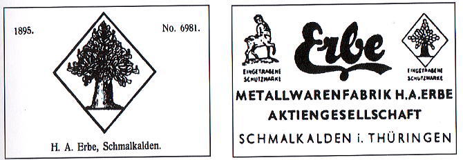 Торговые марки: H.A.Erbe's Deutsche Reich's Bestecke ("Германские королевские столовые приборы Эрбе") (1901г. номер пат. 50784), H A Erbe's Ideal-Abwiegeloffel "Stehauf" ("идеальные чаши весов «стакан с толстым дном» Эрбе") (1903г. номер пат. 62171)