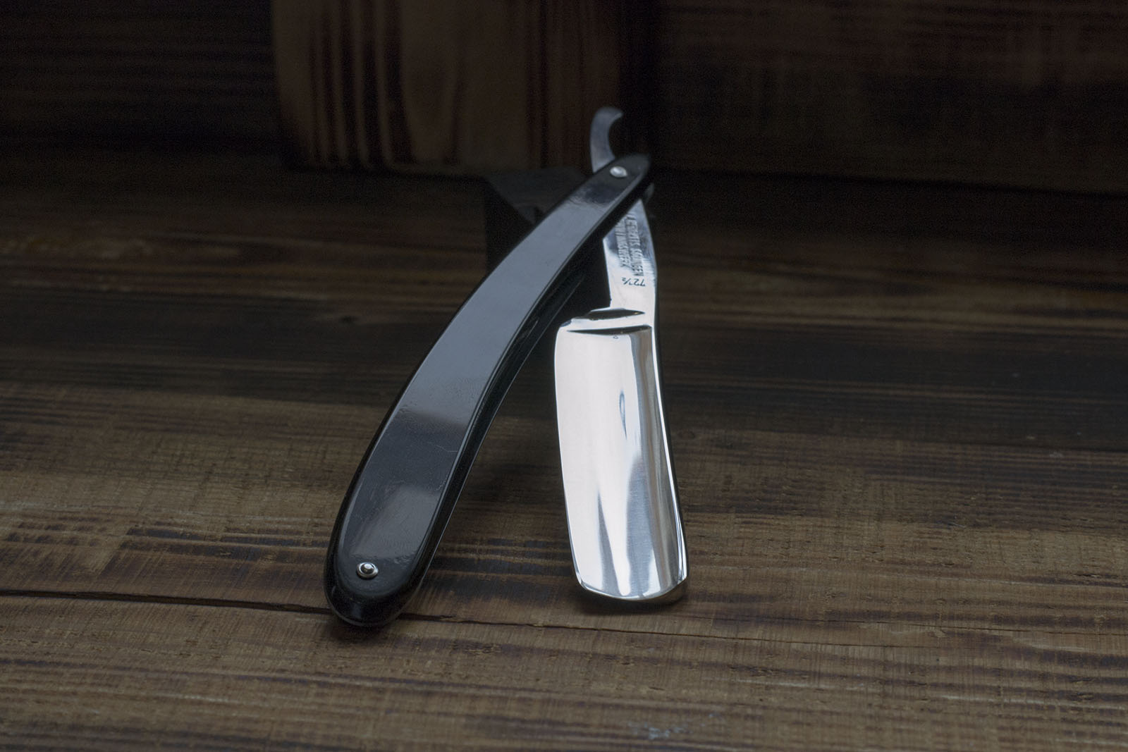 Опасная бритва от Джозефа Востенхольма торговой марки Ebro. Бритва имеет довольно скромные размеры в 5/8 (16.6 мм.), вогнутость полотна примерно 1/2, роговая рукоять, немного длинная, но я уверен что родная, так как не было замечено каких либо следов перестановки - оба пина были одинаковыми, аутентичные латунные шайбы, которые удалось сохранить. Бритва точилась мало и аккуратно, поэтому размер полотна близок к оригинальному. На эрле присутствует клеймо England, что может смутить любителей датировки бритв по Standart Guide, несмотря на его наличие я уверен что бритва выпущена ранее 1890-х, а именно дата выпуска примерно 1860 - 70 гг, об этом говорит и период работы фабрики, и форма полотна в сочетании с материалом рукояти. Бритва имеет прекрасную геометрию - фаска тонкая и равномерная по всей длине, углеродистая сталь высокого качества хорошо проявившая себя в заточке. Бритва крайне интересна, особенно рекомендую новичкам, так же будет удобна при окантовке. Продано EBRO Show