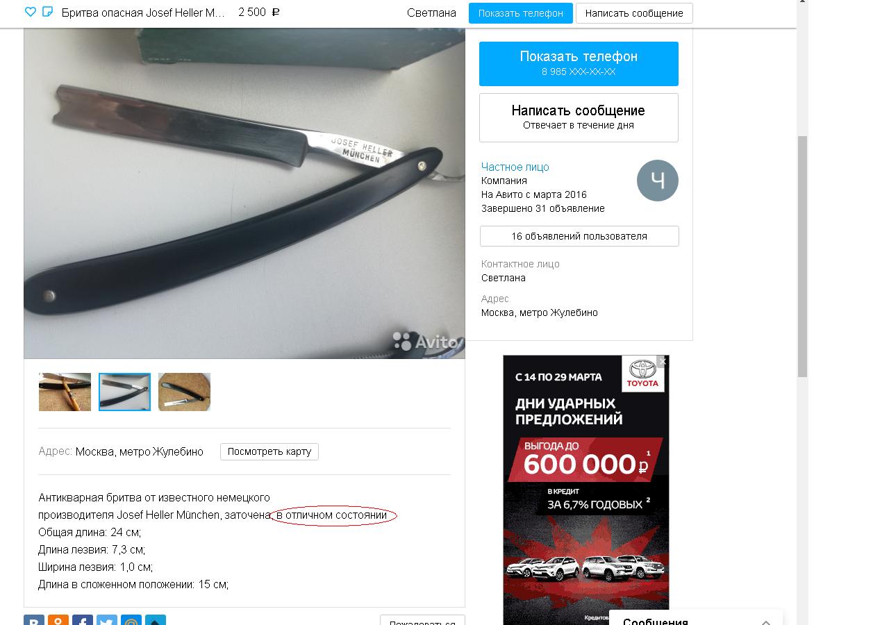 Аукционы: плагиат, развод и "великолепные" описанияОбычная цена на такие вещи на ОЛХ Насчет раритета вопрос сложный. Раритет - значит редкая старинная вещь. В Британии возраст антиквариата определяется не менее 100 лет, в США - не ранее 1830 г. На постсоветских просторах большинство антикварных салонов определяют этот возраст в 50 лет и более. Хоть эта модель самая штатная, но в наше время само изделие - опасная бритва - уже раритет для "пересічного громадянина". Если бы она была в непользованном или хотя бы идеальном состоянии, можно было бы с натяжкой говорить о раритете. А так - просто люди, чуя веяния моды и возрастание спроса на подобные вещи в определенных кругах, пытаются что-то заработать, выдавая желаемое за действительное. Такие дела Волхвы не боятся могучих владык,